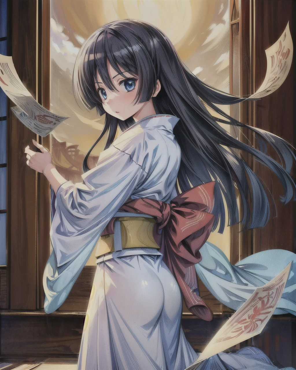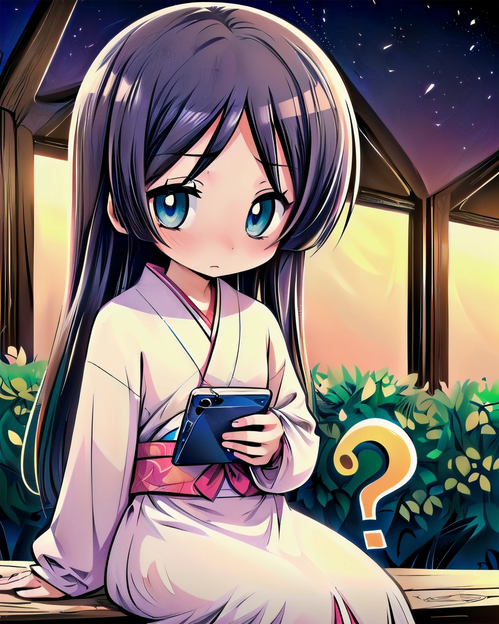 I did a little experiment this time and added an additional concept for the character, which is her frequently used gesture of raising her (oversized) kimono sleeve towards her face or mouth. It is represented by the tag "IsumiRaisedSleeve". It's not super consistent due to the lack of image material, and due to a high number of repititions used will sometimes bleed into images that don't have this tag; one way to alleviate this is to add the tag as a negative if you don't want it.