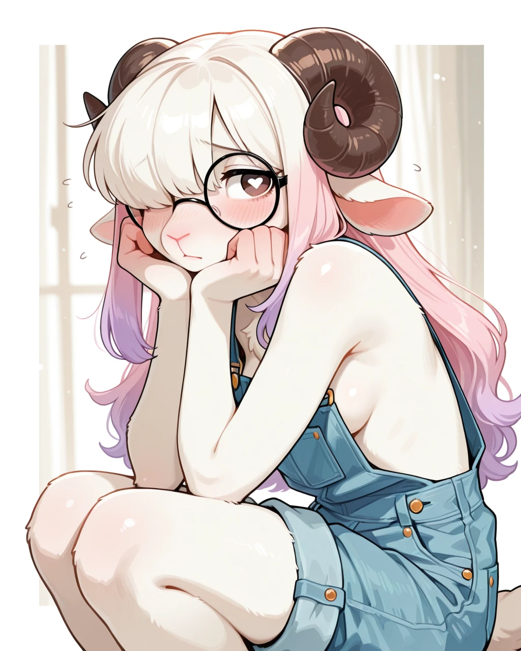 anthropomorphic sheep girl, long slim build, pastel purple dyed tips, small rounding horns, round thin framed glasses, long straight hair, loose face-framing strands,