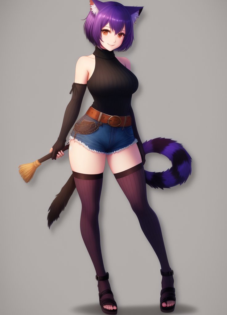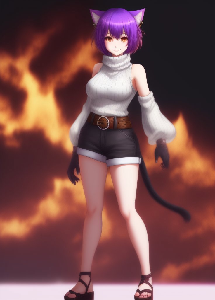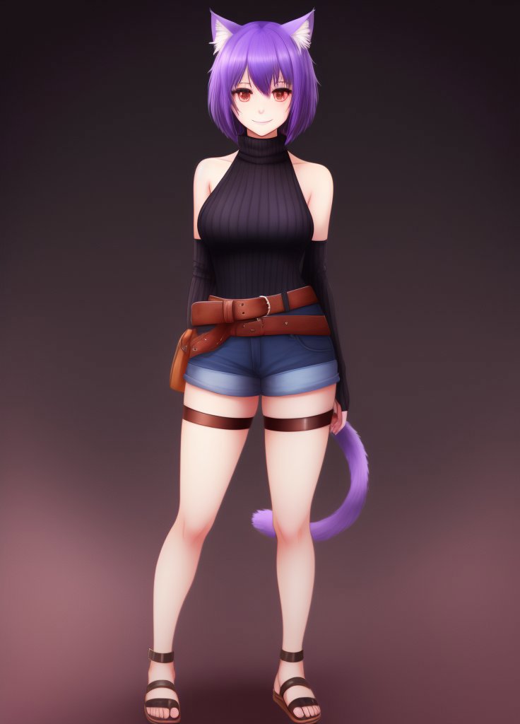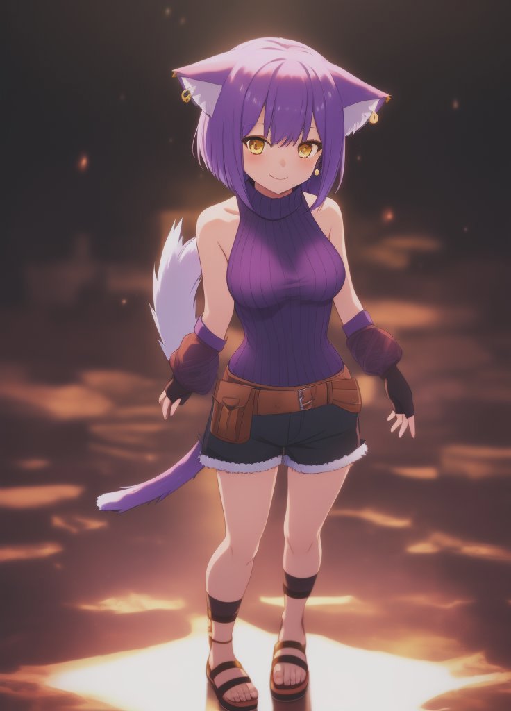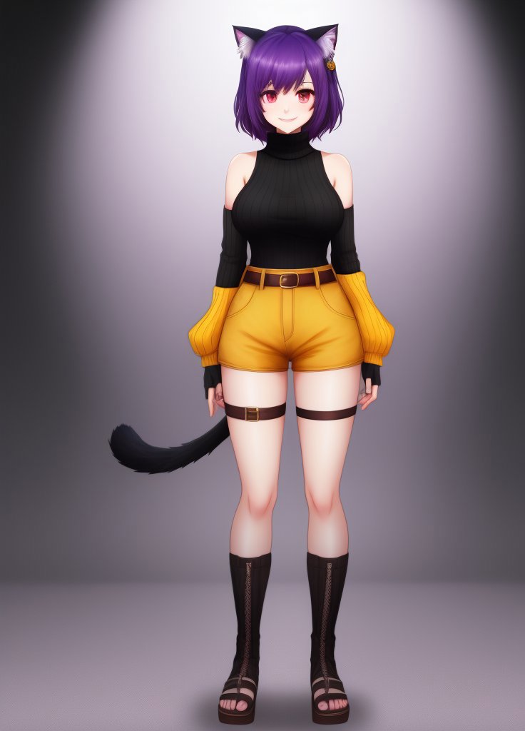 Mineko, 1girl, animal ear fluff, animal ears, arms at sides, bare shoulders, belt, between breasts, black background, black gloves, black sweater, breasts, brown shorts, cat ears, cat girl, cat tail, closed mouth, earrings, fingerless gloves, full body, gloves, jewelry, knee pads, looking at viewer, medium breasts, purple hair, ribbed sweater, sandals, short hair, short shorts, shorts, sleeveless, sleeveless sweater, smile, solo, standing, sweater, tail, turtleneck, yellow eyes