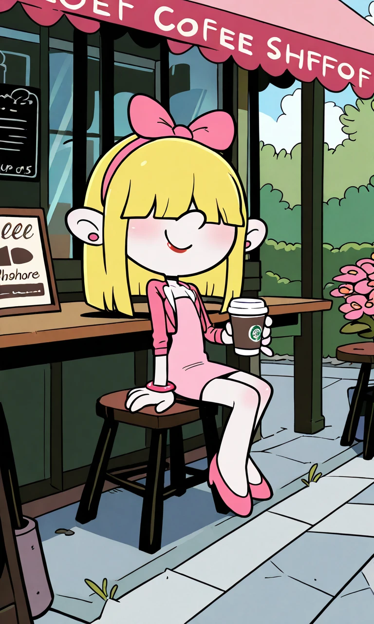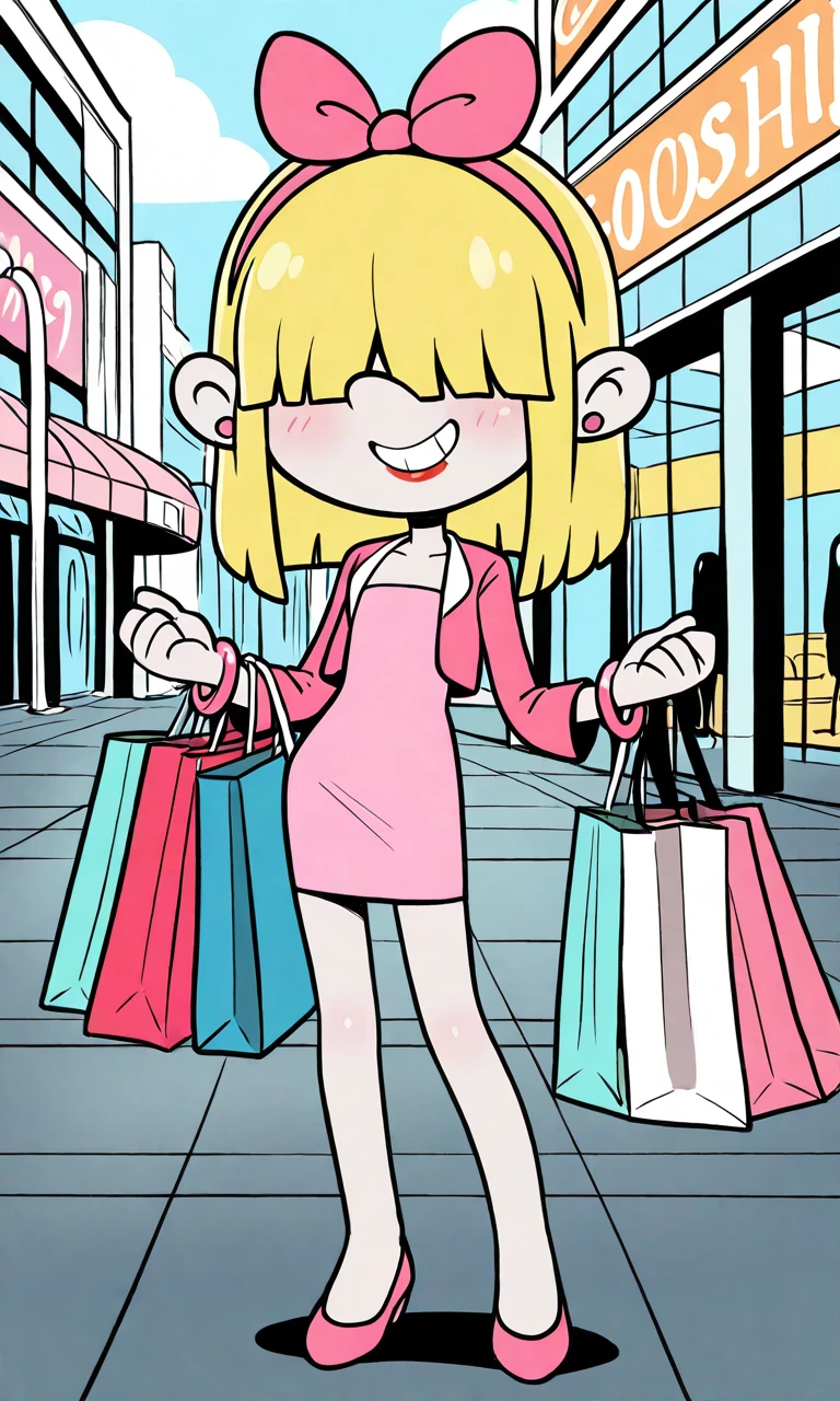 Makeover: blonde hair, blunt bangs, red lipstick, pink bow, pink hairband, pink stud earrings, pink cropped jacket, pink strapless dress, pink bracelet, pink footwear