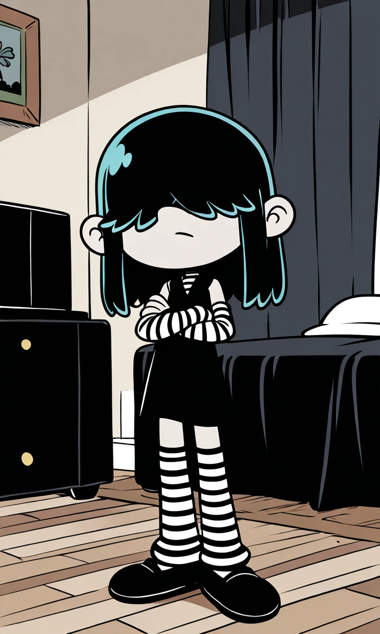 Outfit: sleeveless black dress, striped shirt, black and white shirt, shirt under dress, striped arm warmers, black and white arm warmers, striped thighhighs, black and white thighhighs, black footwear