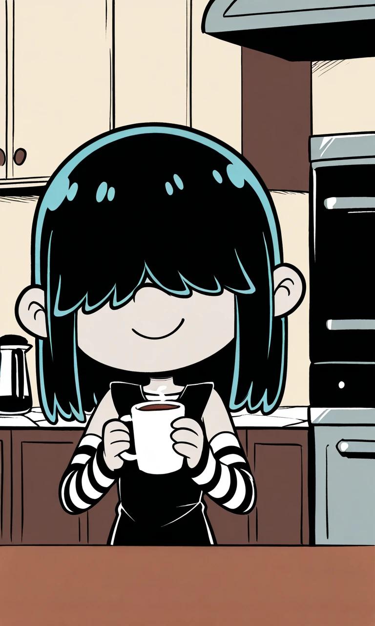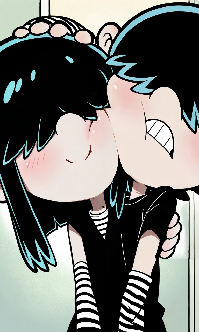 Base prompt: 1girl, chibi, solo, medium hair, black hair, blue hair, bangs, hair over eyes, covered eyes