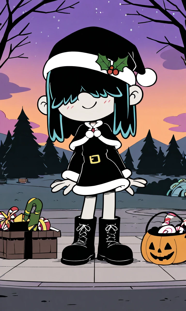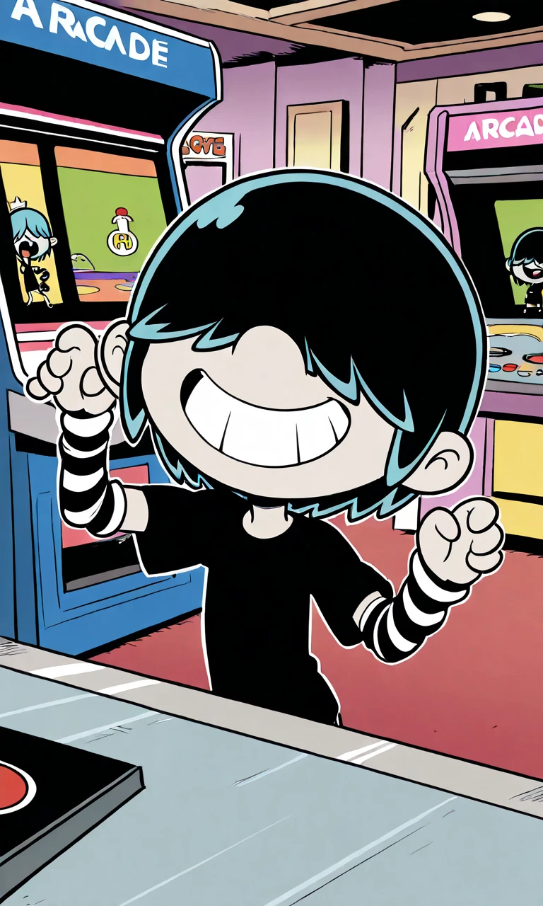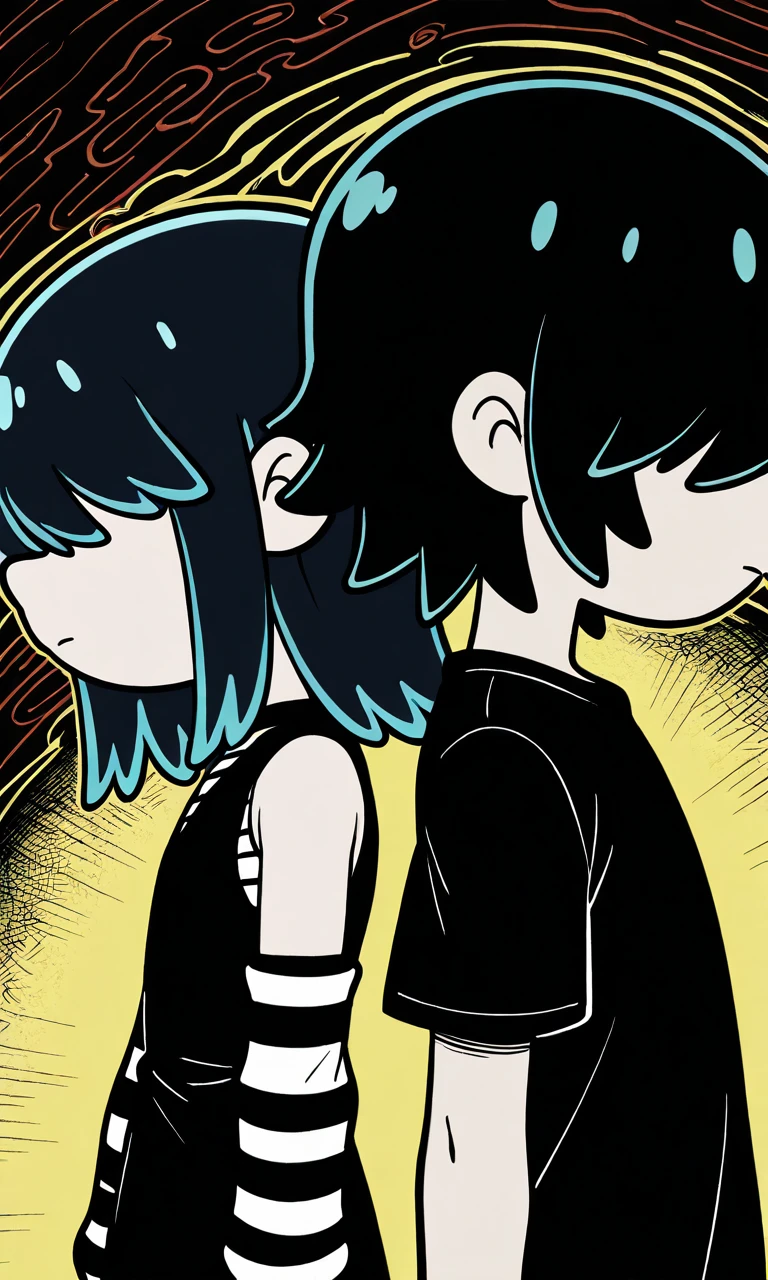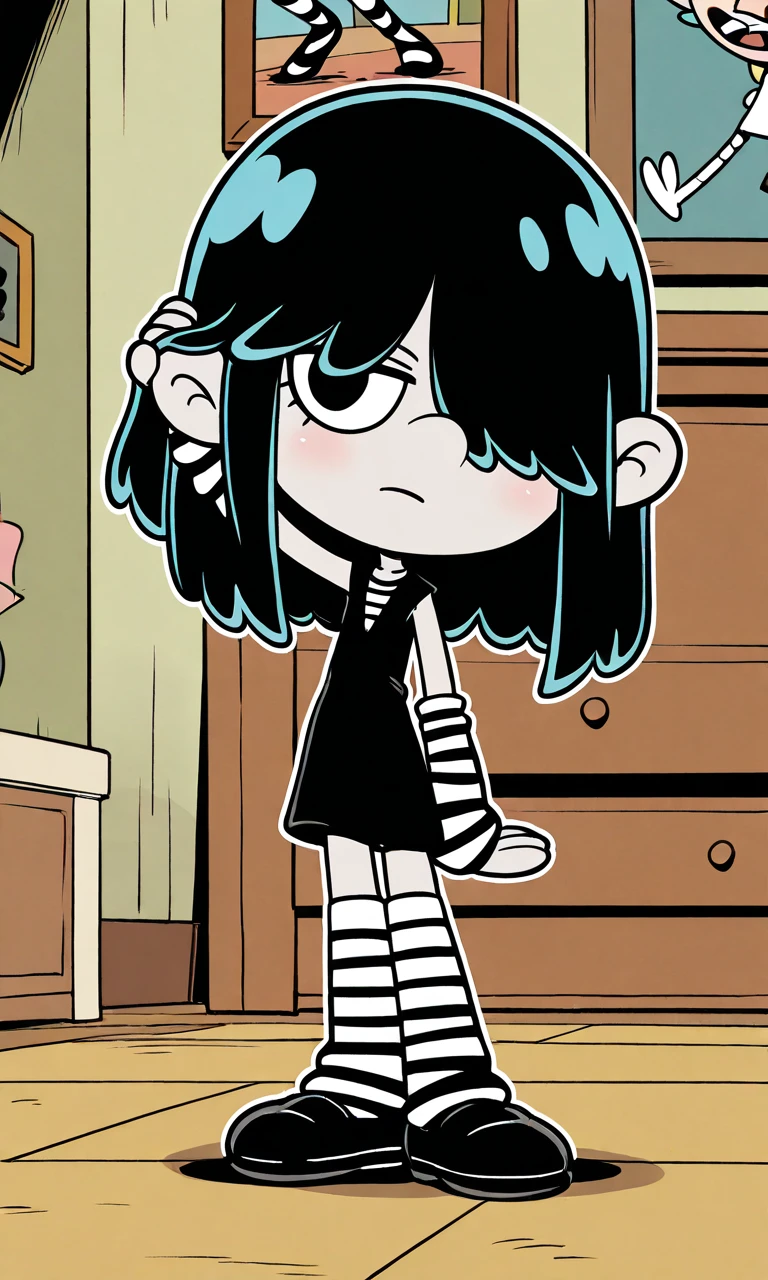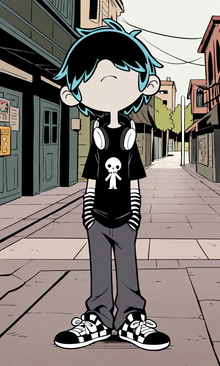 Lars: 1boy, chibi, solo, short hair, black hair, blue hair, hair over eyes, covered eyes, short sleeves, black shirt, striped arm warmers, black and white arm warmers, grey pants, checkered shoes