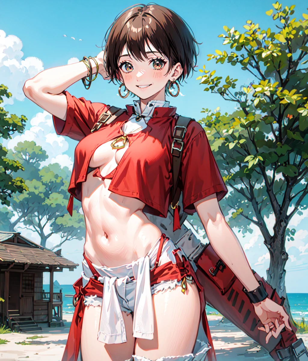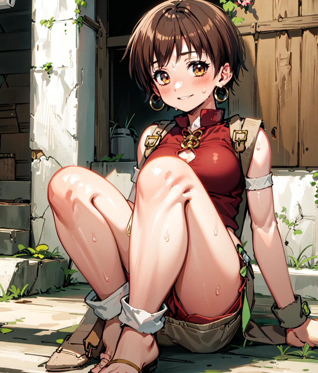 Notable tags: short hair, brown hair, earrings, red top, loincloth, wristbands