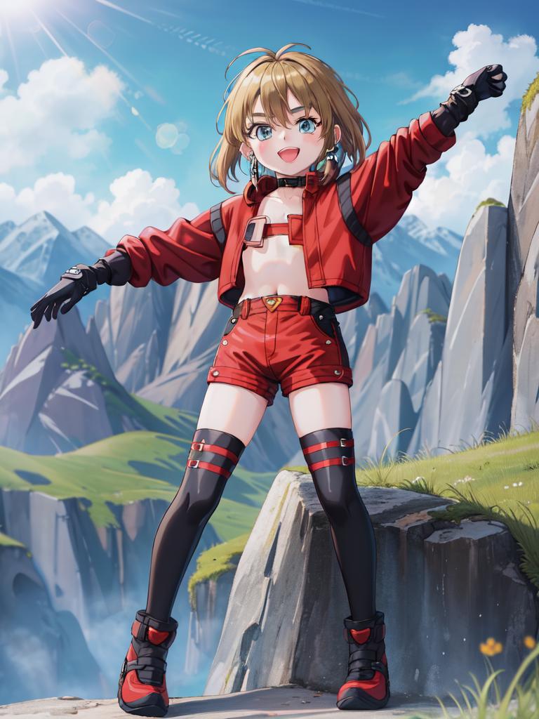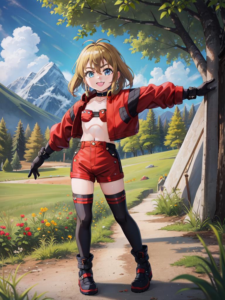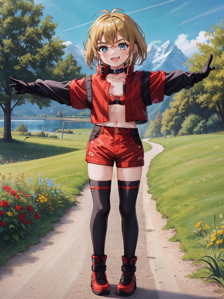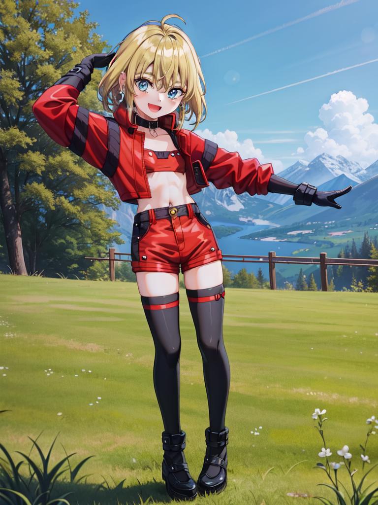 Default Outfit: red jacket, cropped jacket, red shorts, thighhighs, gloves, choker, jewelry, earrings