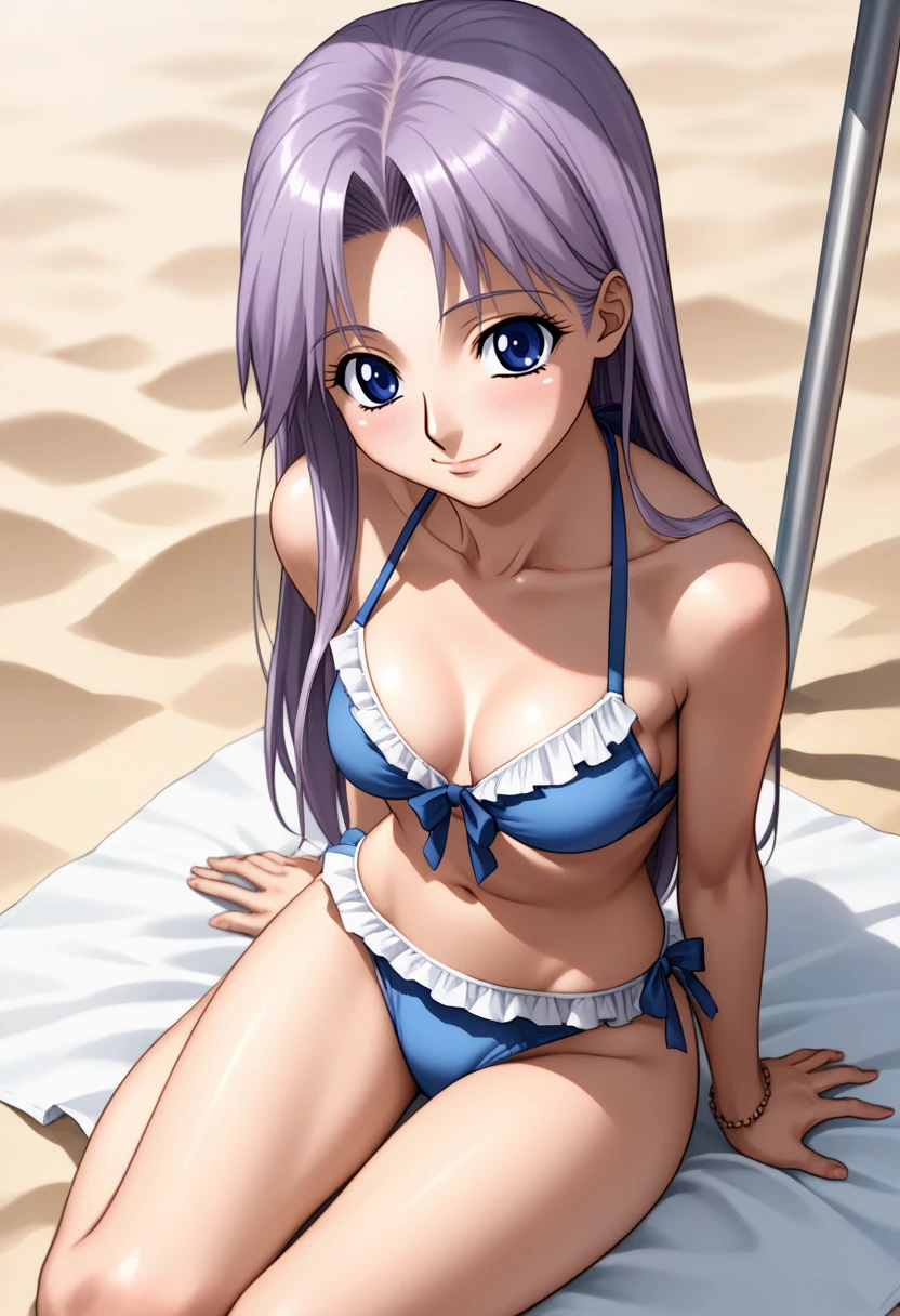 pilot suit, blue armor, breastplate, covered navel, blue bodysuit, white gloves, long sleeves, blue sleeves, skin tight, purple hair, sidelocks, parted bangs, long hair, blue eyes