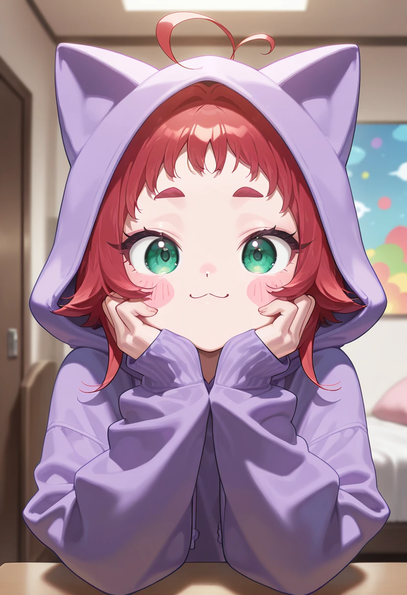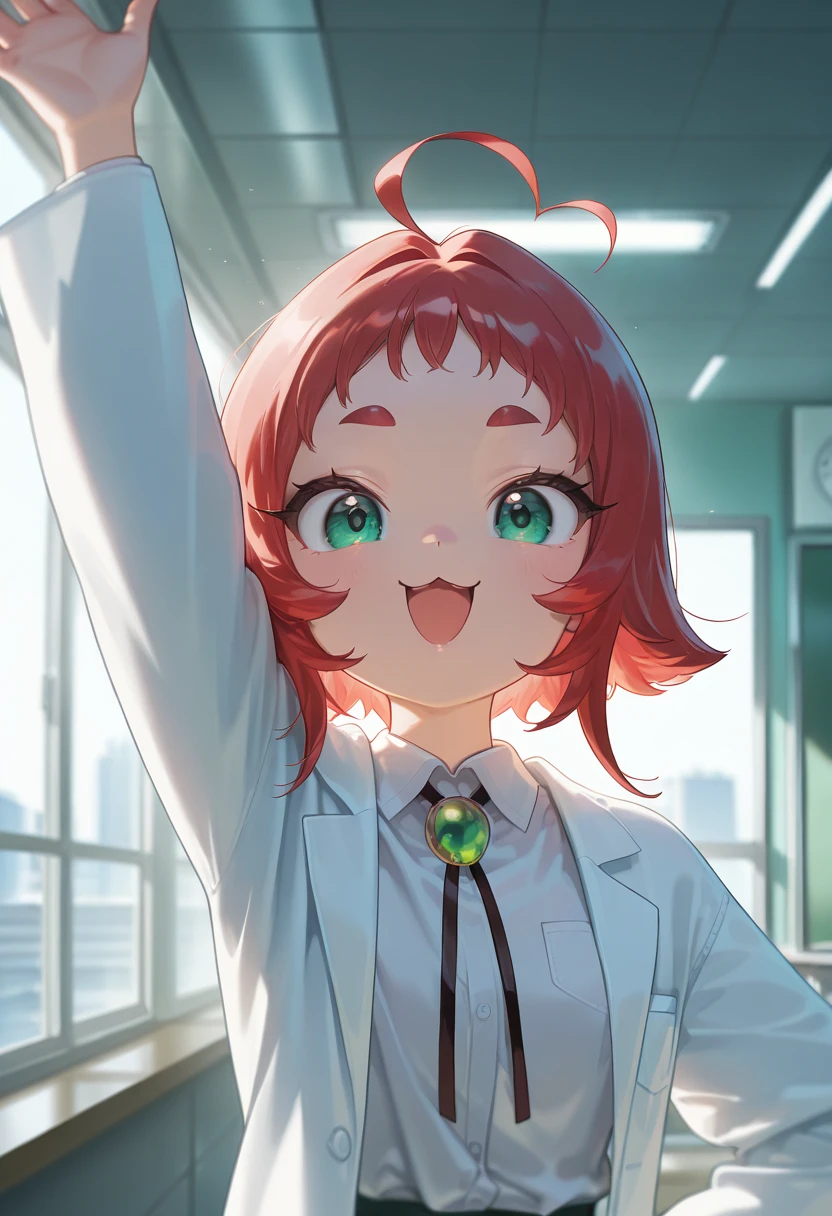 1girl, solo, short hair, green eyes, red hair, thick eyebrows, short eyebrows, antenna hair, ahoge, :3