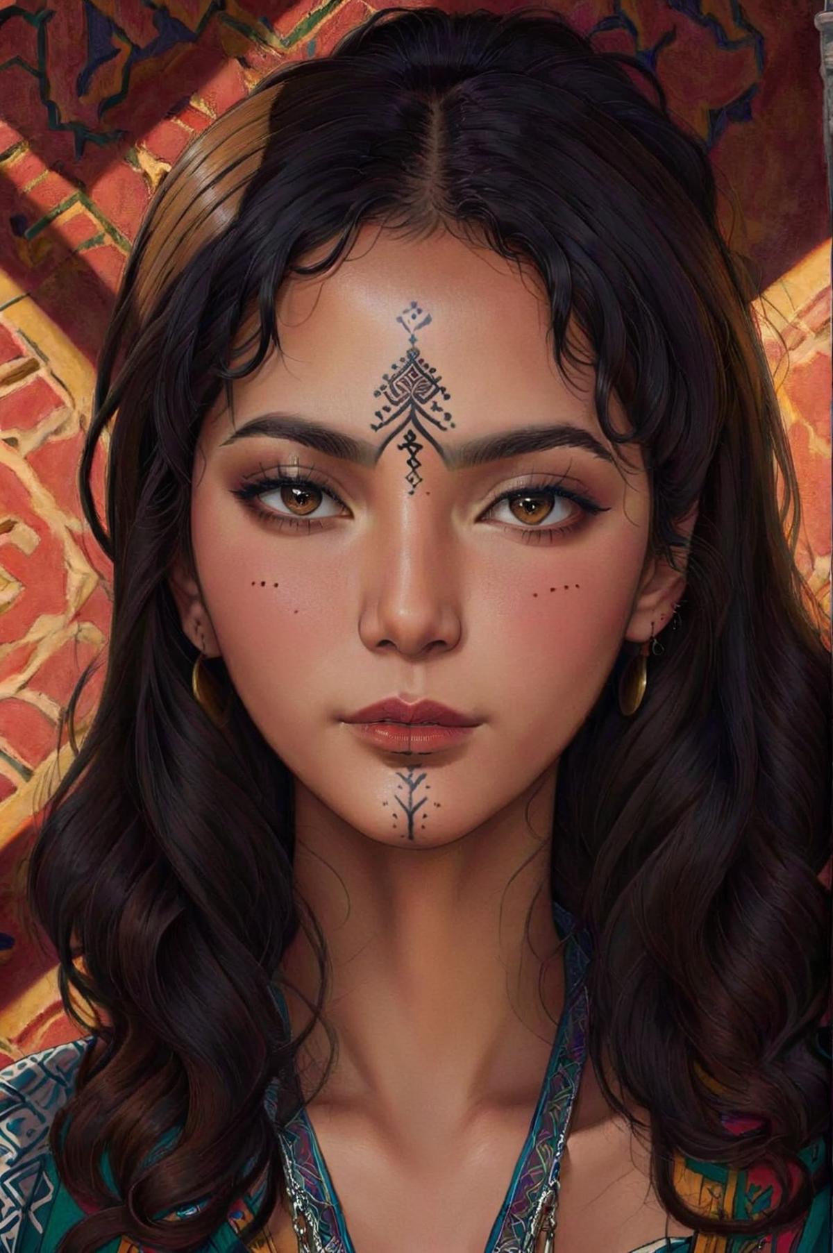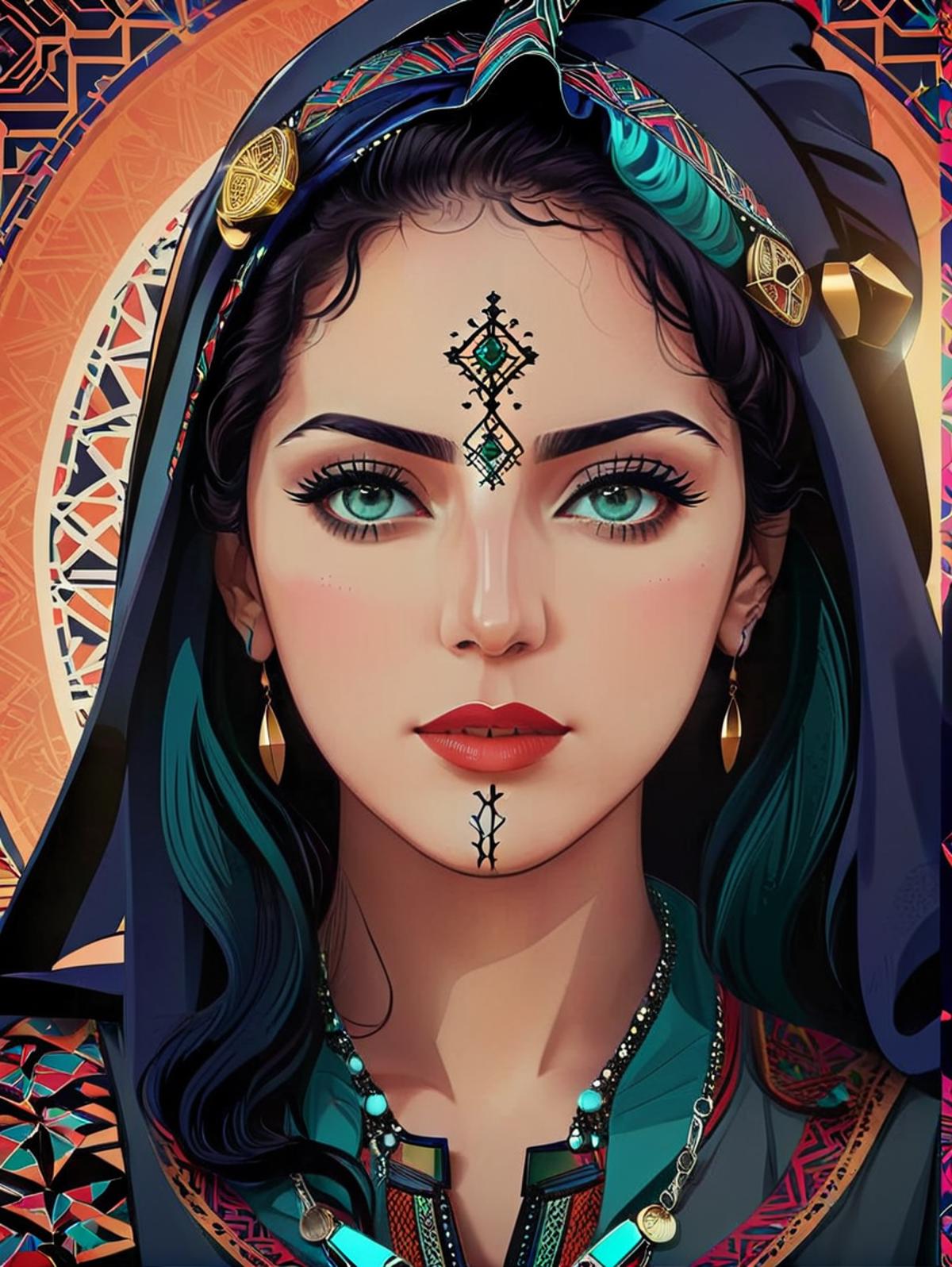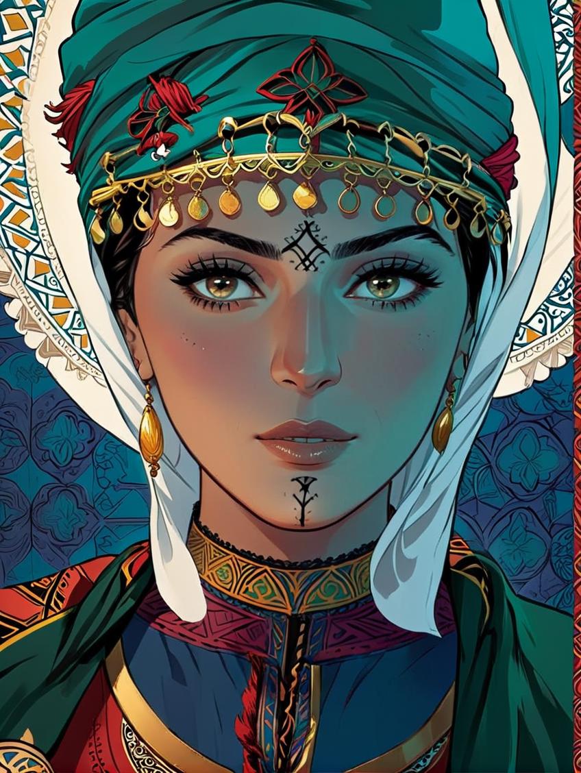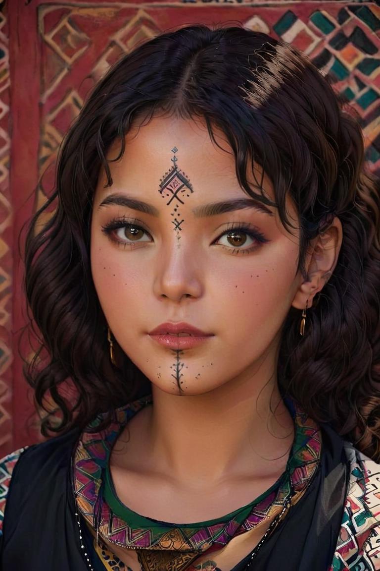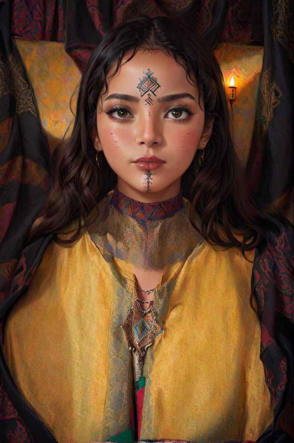 full body portrait, 1girl, perfect face (traditional chin tattoo, Ushamxl:1.2), Moroccan traditional attire, Moroccan pattern background, <lora:UshamXL:1.2>I found the values between 0.8 and 1.2 works best. (<lora:UshamXL:1.2>)