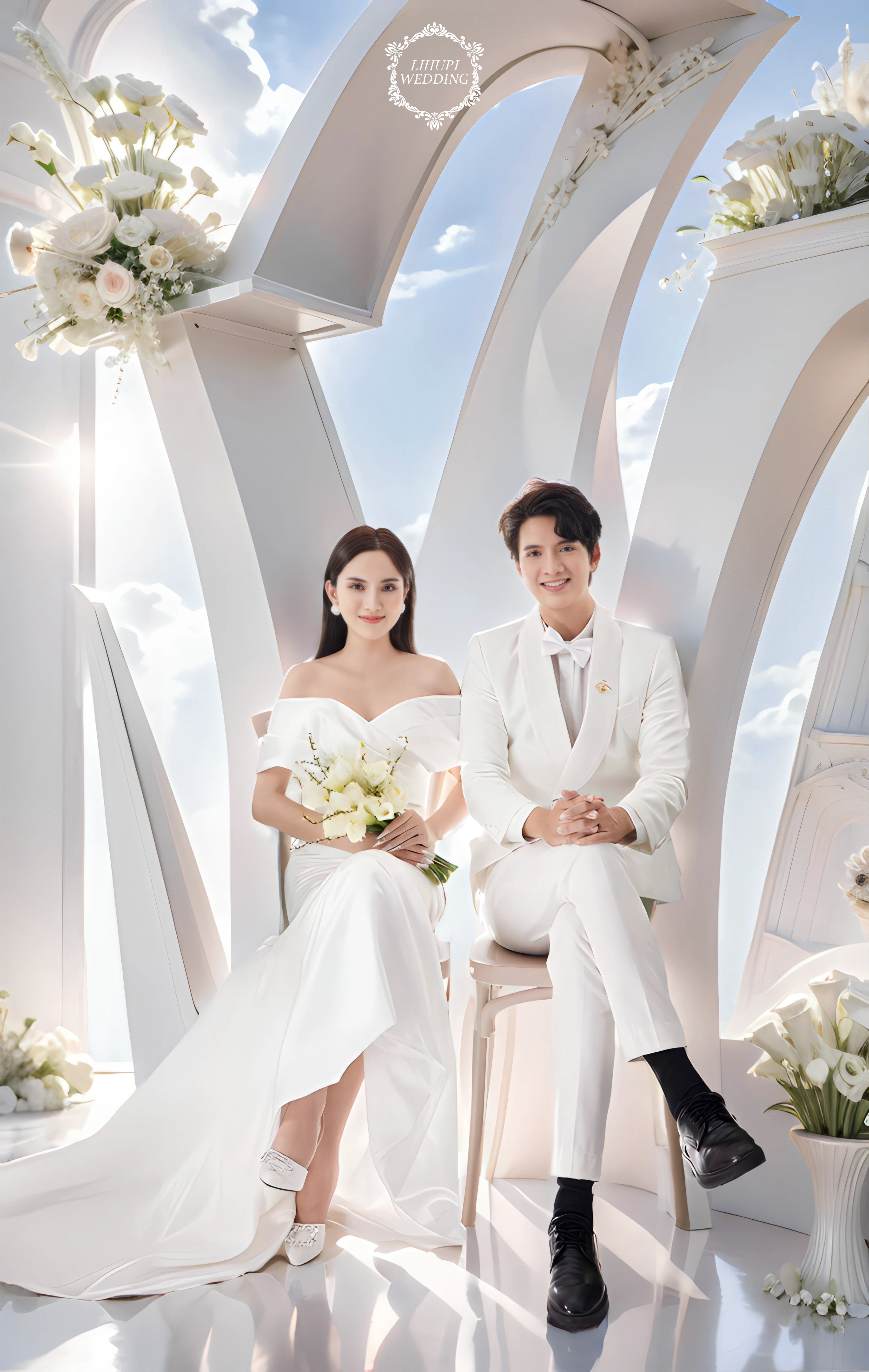 “Elegant wedding scene featuring a bride in a stunning white gown and a groom in a white suit, standing under a beautifully decorated floral arch with white and pink flowers. The background showcases a bright sky with soft, fluffy clouds. Include large floral arrangements in white vases and ensure the lighting is soft and natural, creating a dreamy, romantic ambiance.”