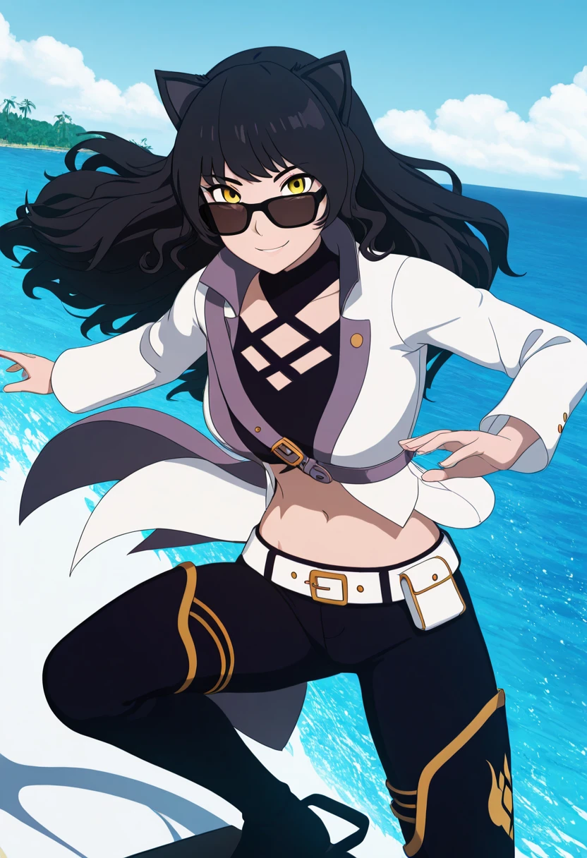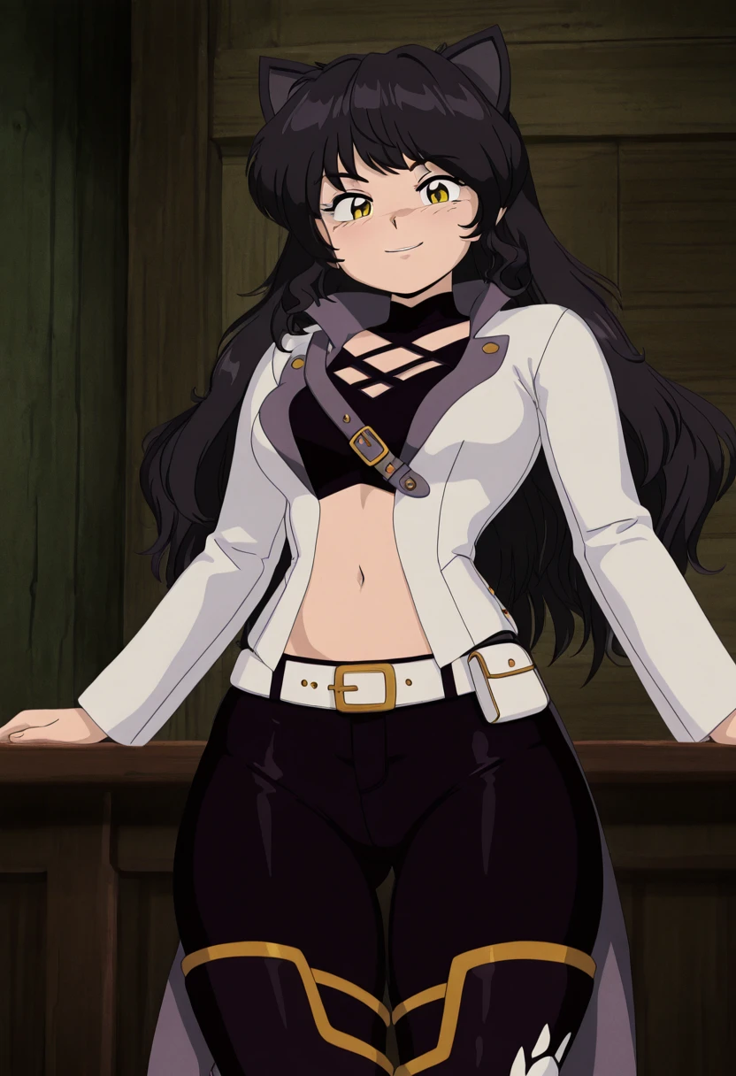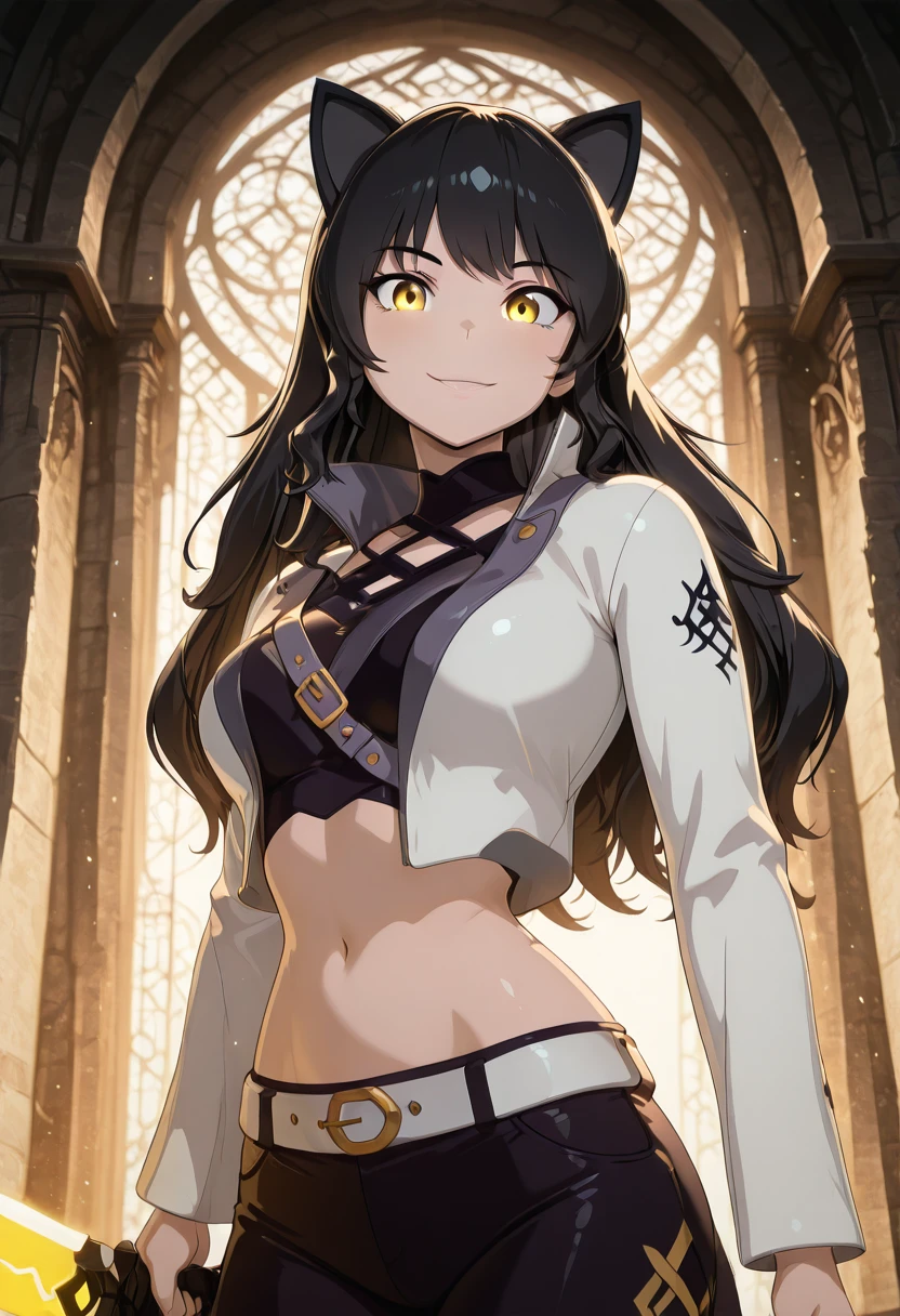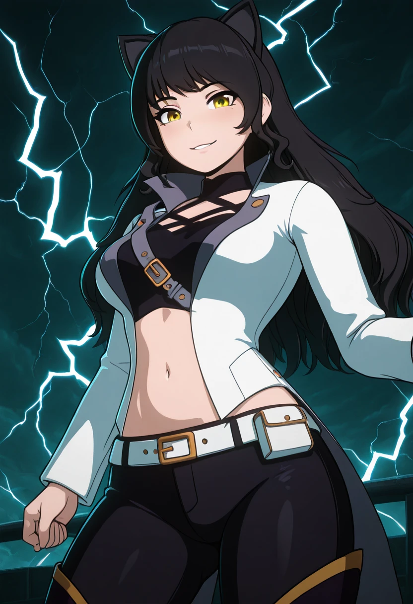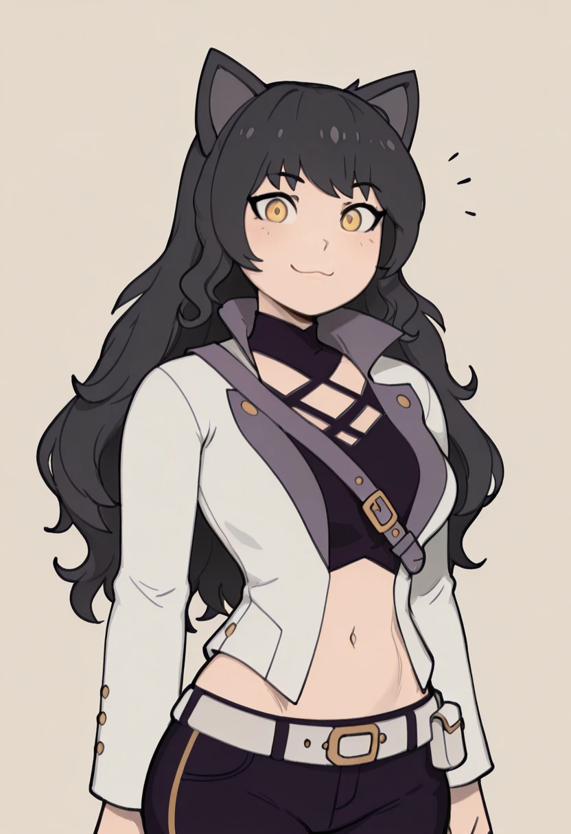 zzBlake, yellow eyes, black hair, long hair, cat ears, midriff, belt, navel, jacket, white jacket, long sleeves, pants,