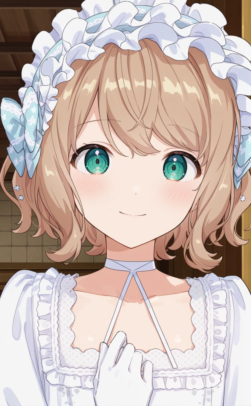 white choker,frills,white dress,frilled dress,puffy short sleeves,white gloves,white pantyhose,blue footwear