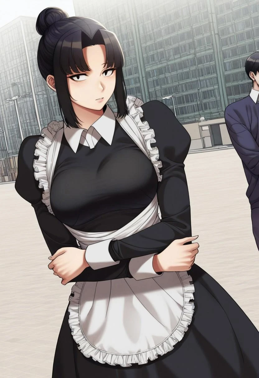 1girl, Heo_Seung-Ah(69_University) , black_hair, single_hair_bun, hair_bun, maid, maid_outfit, maid_apron, maid_headdress, long_sleeves, long_dress, puffy_sleeves, juliet_sleeves, , black_dress, frills, white_apron, frilled_apron, shirt, collared_shirt, parted_lips, black_eyes, cats_eyes, large_breasts, bangs, parted_bangs, white_thighhighs, black_footwear, black_high_heels