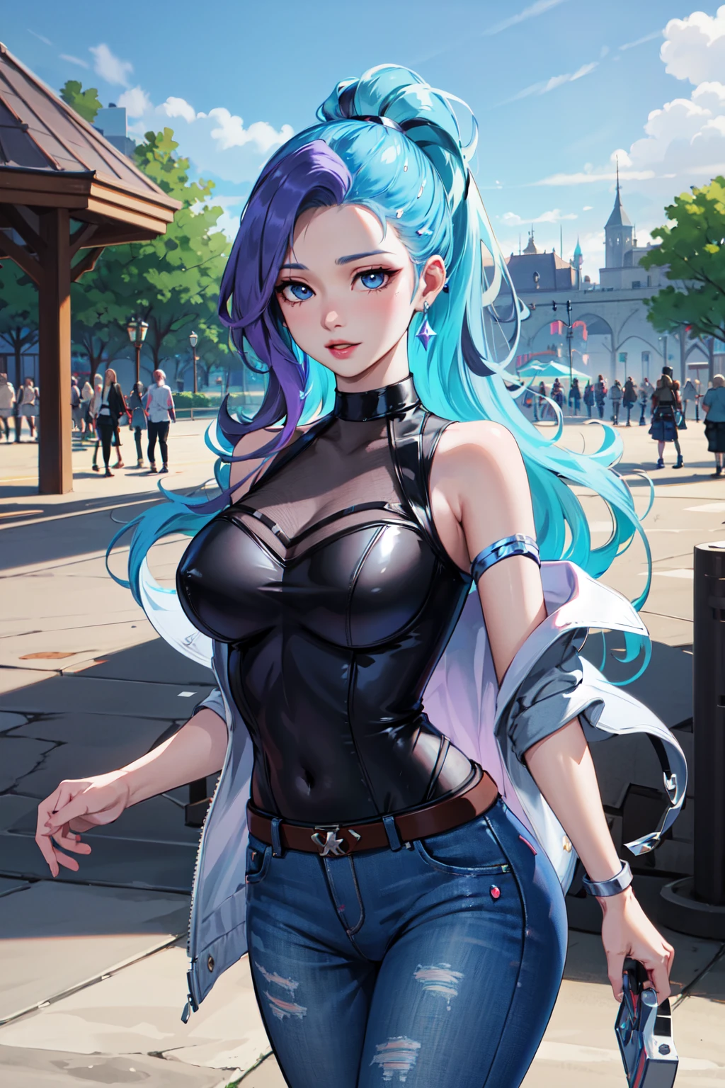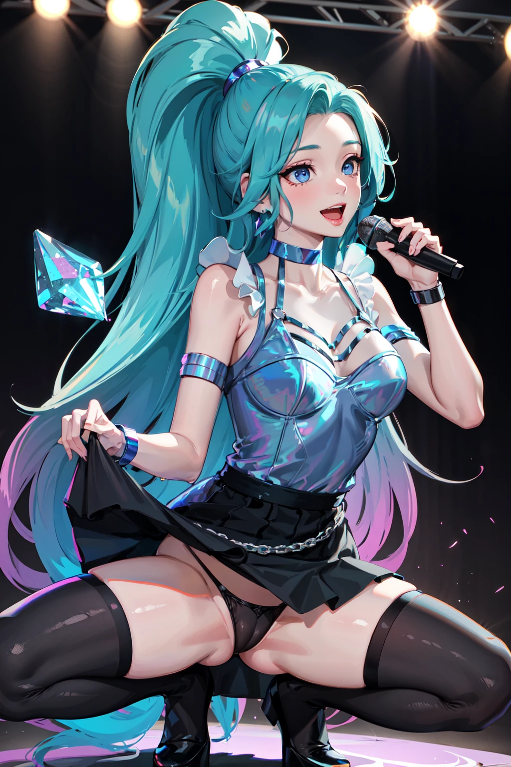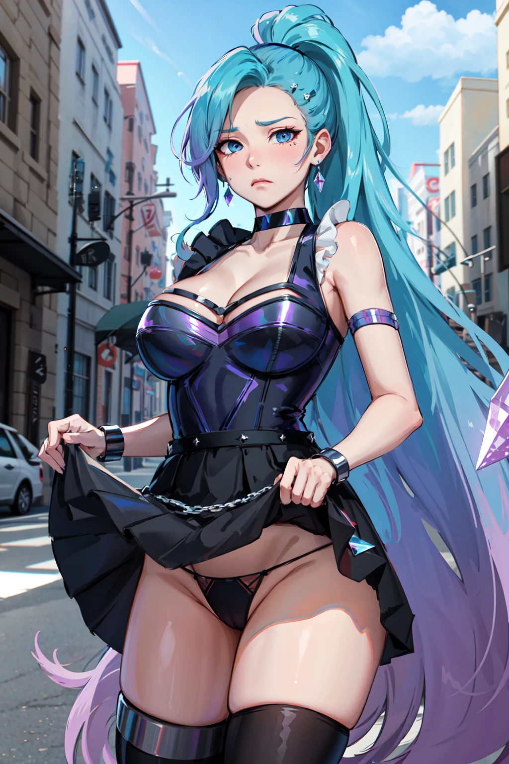 seraphine1, 1girl, solo, blue hair, k/da \(league of legends\), very long hair, multicolored hair, jewelry, ponytail, blue eyes, earrings, dress, black choker, two-tone hair, purple hair, black thighhighs, bracelet, black skirt, crystal