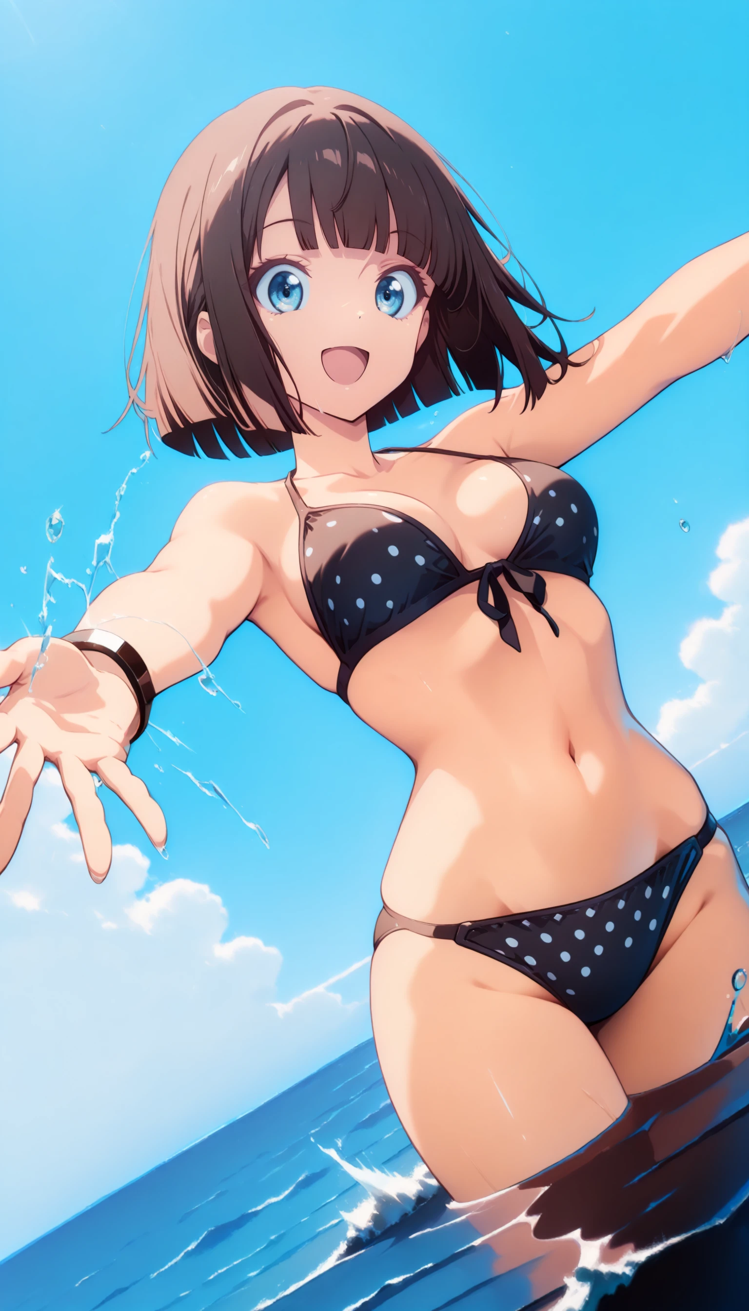 まやちゃんのお気に入りの水着を生成するには、black bikini, polka dot bikini, white polka dot を使用してください。
