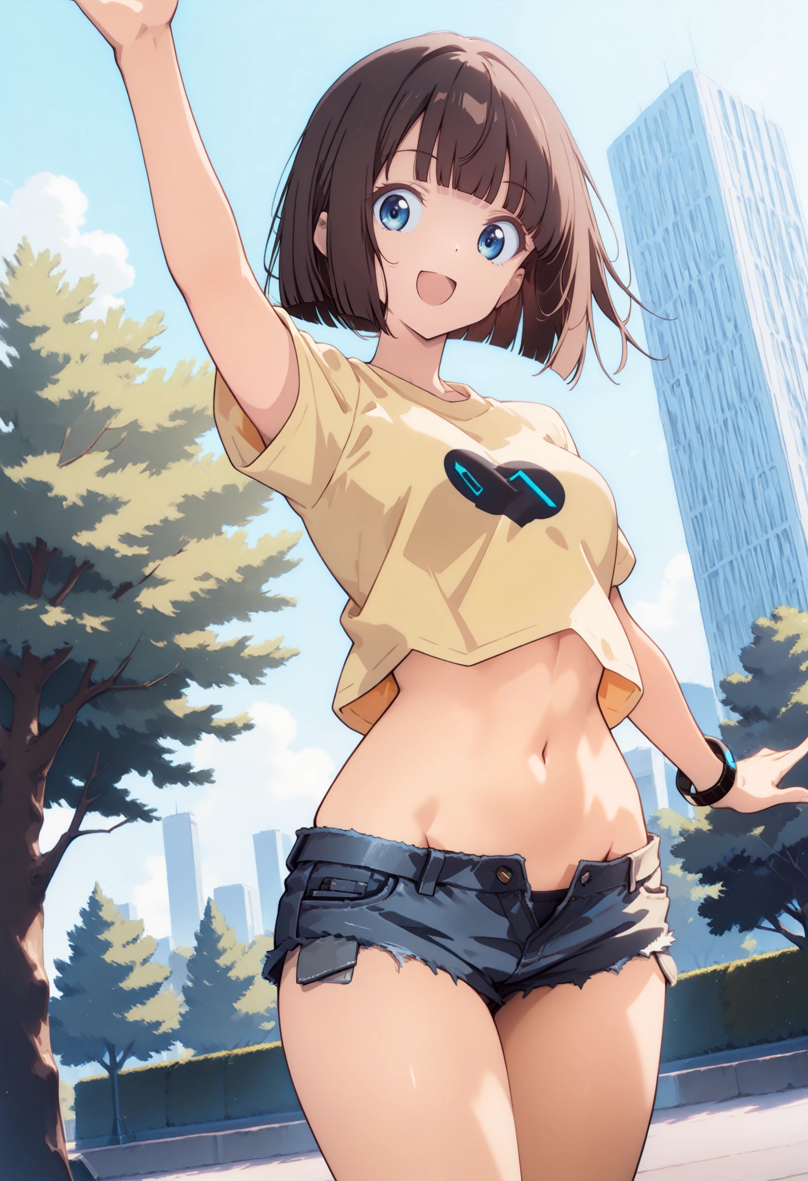 また、普段着を再現するには、t-shirt, yellow shirt, short shorts, denim shorts, open fly を追加してください。