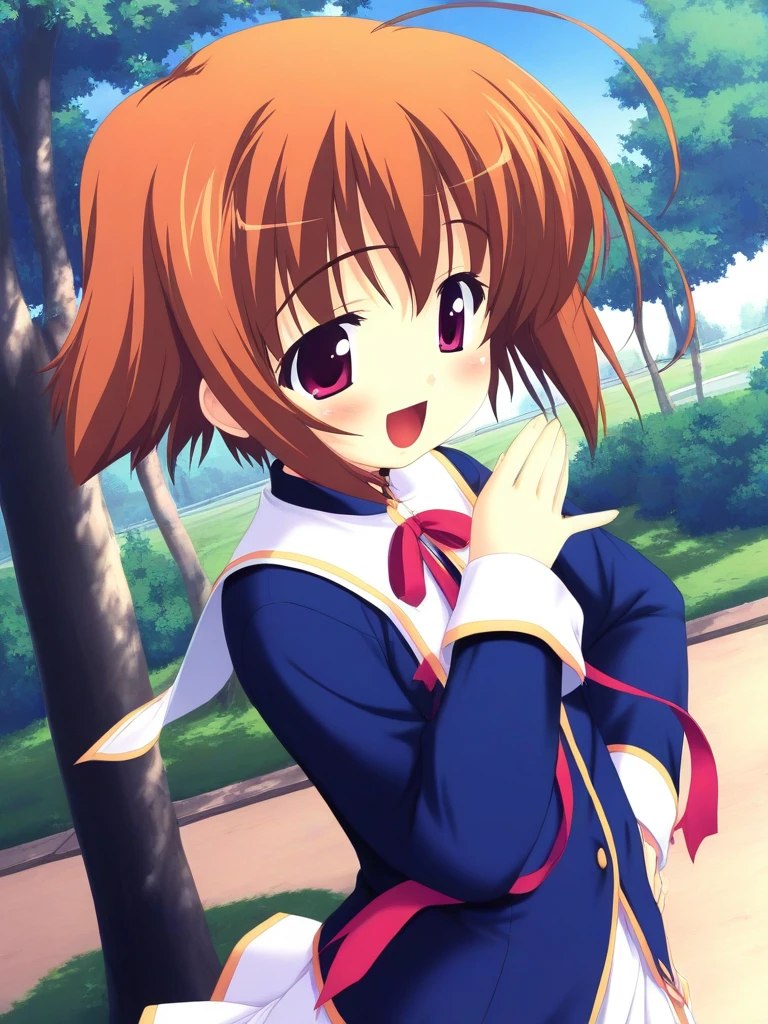 Takamori_Natsuki, solo, brown hair, short hair, red purple eyes, ahoge,