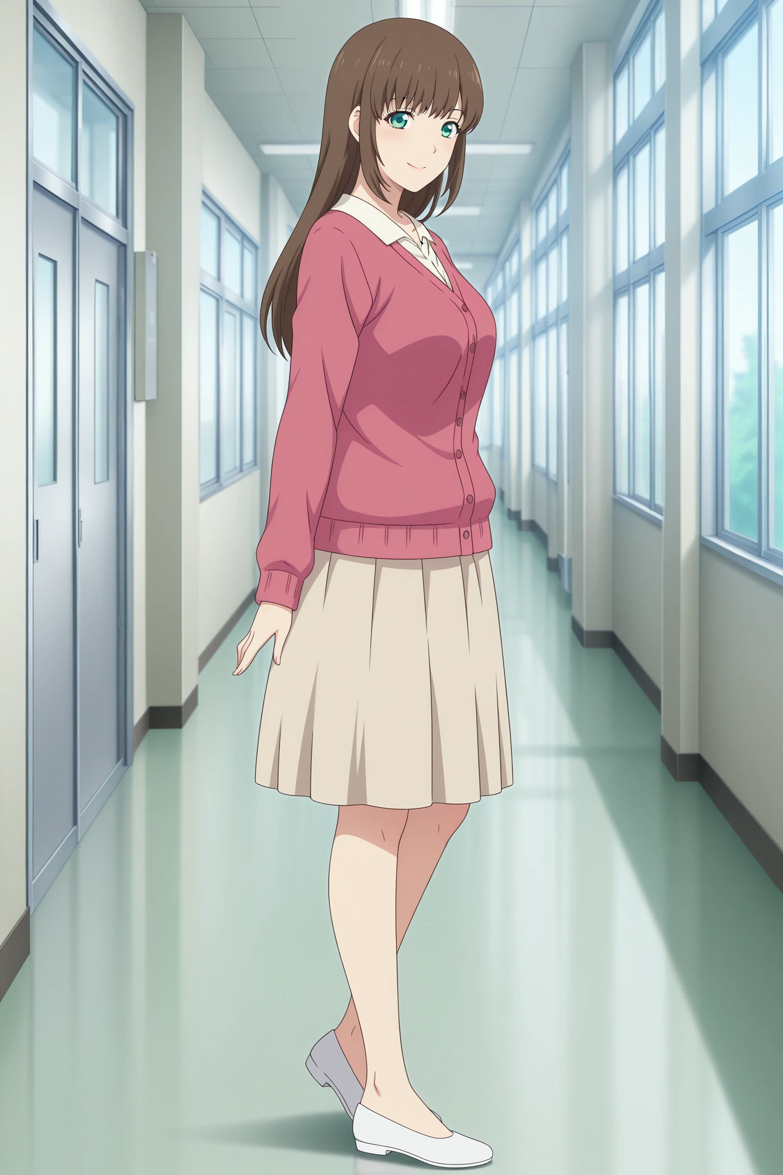 tachibana hina, long hair, brown hair, sidelocks, choppy bangs, green eyes, long sleeves, pink cardigan, white shirt, collared shirt, untucked shirt, brown shirt, medium shirt, white footwear, flats