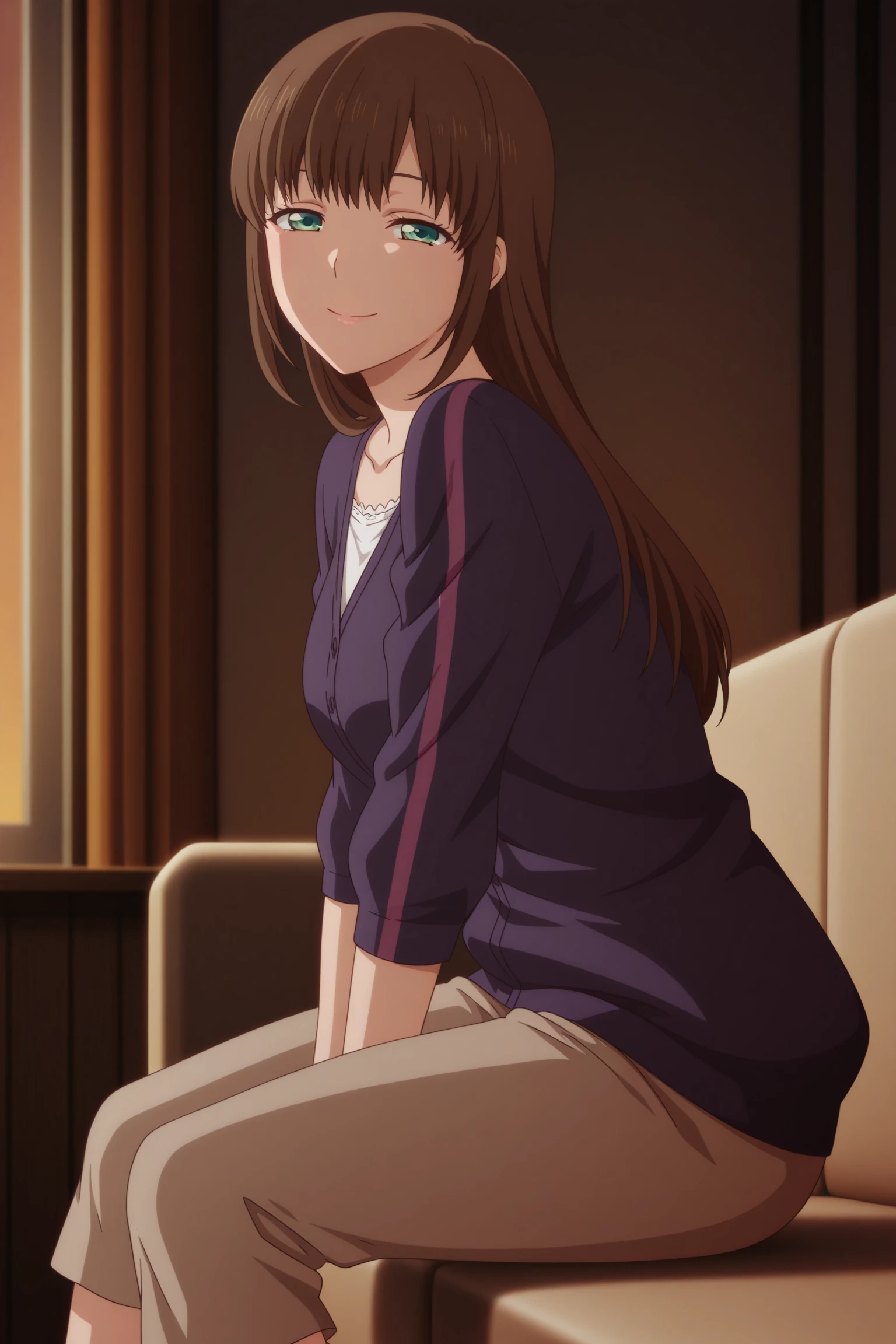 tachibana hina, long hair, brown hair, sidelocks, choppy bangs, green eyes, three-quarter sleeves, pink cardigan, purple cardigan, white shirt, lace-trimmed shirt, untucked shirt, brown pants, capri pants