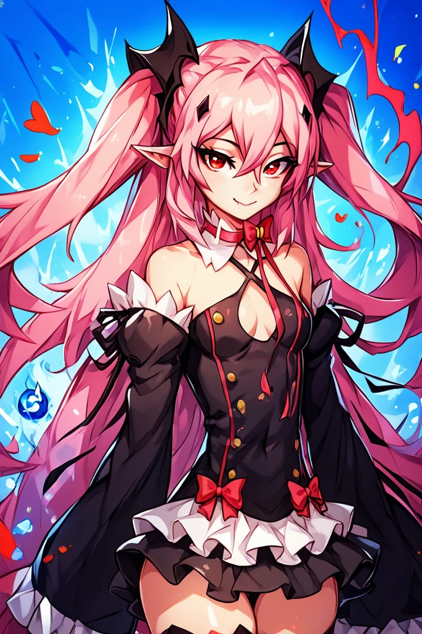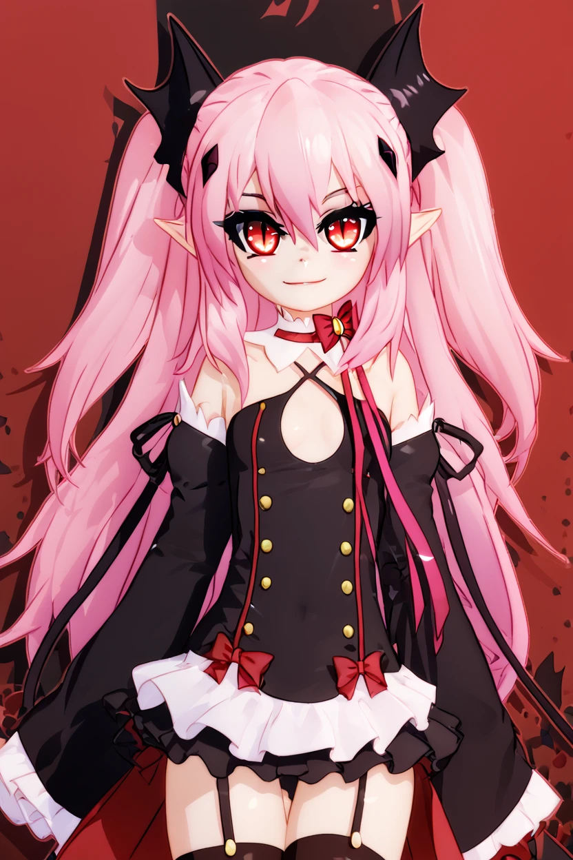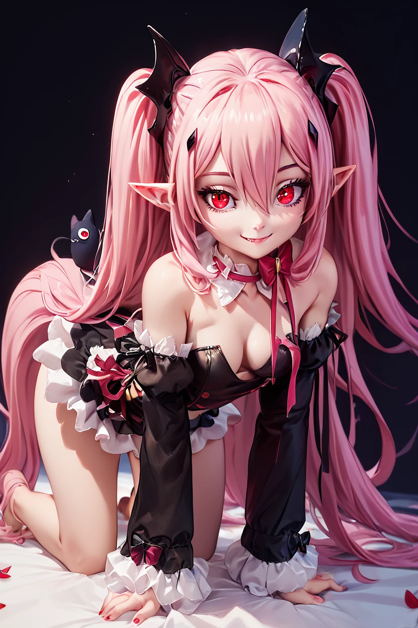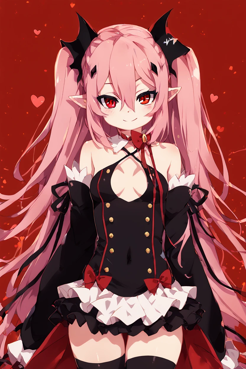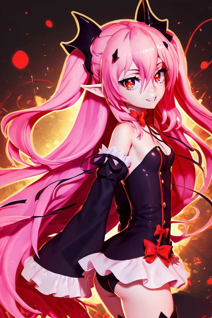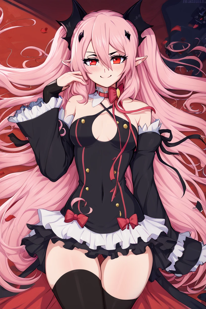 zzKrul, pink hair, long hair, pointy ears, red eyes, vampire, hair between eyes, very long hair, two side up, detached sleeves, bare shoulders, black dress, ribbon, bow, hair ornament, thighhighs,