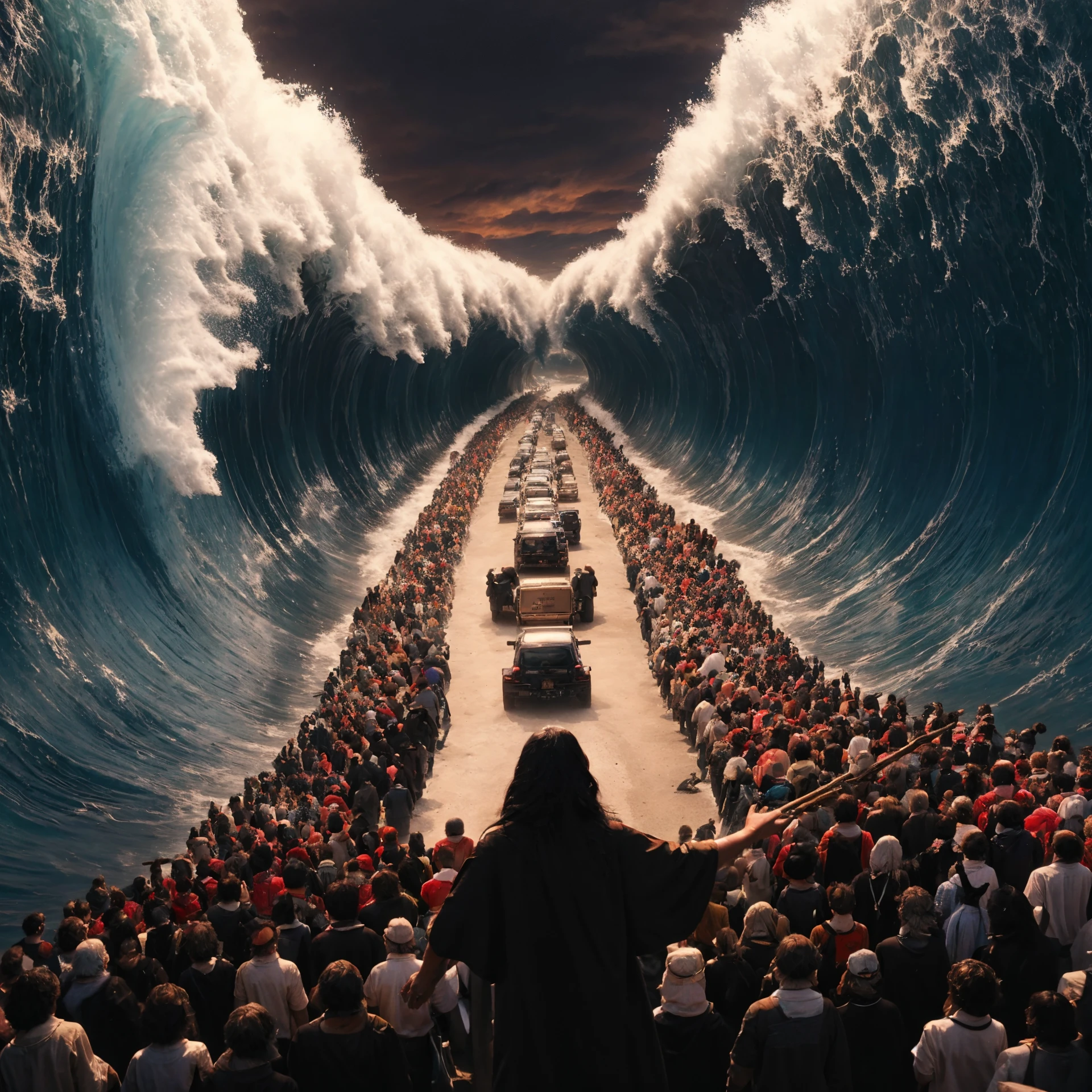 This Lora tries to recreate the scene of Parting the Red Sea and crossing it. Works with Realistic Model, Anime Model. If the Lora tends to generate "from behind" image, you can lower the weight to have a better result.