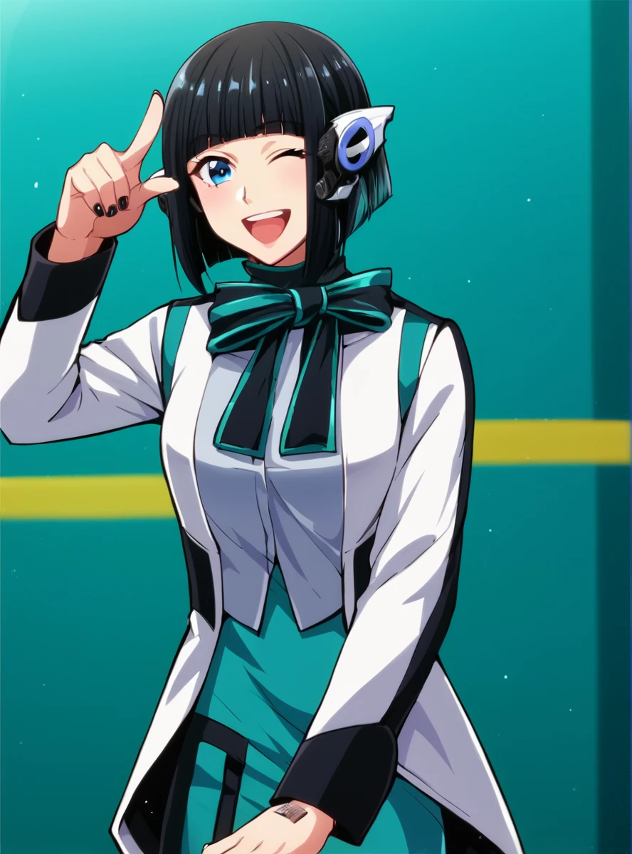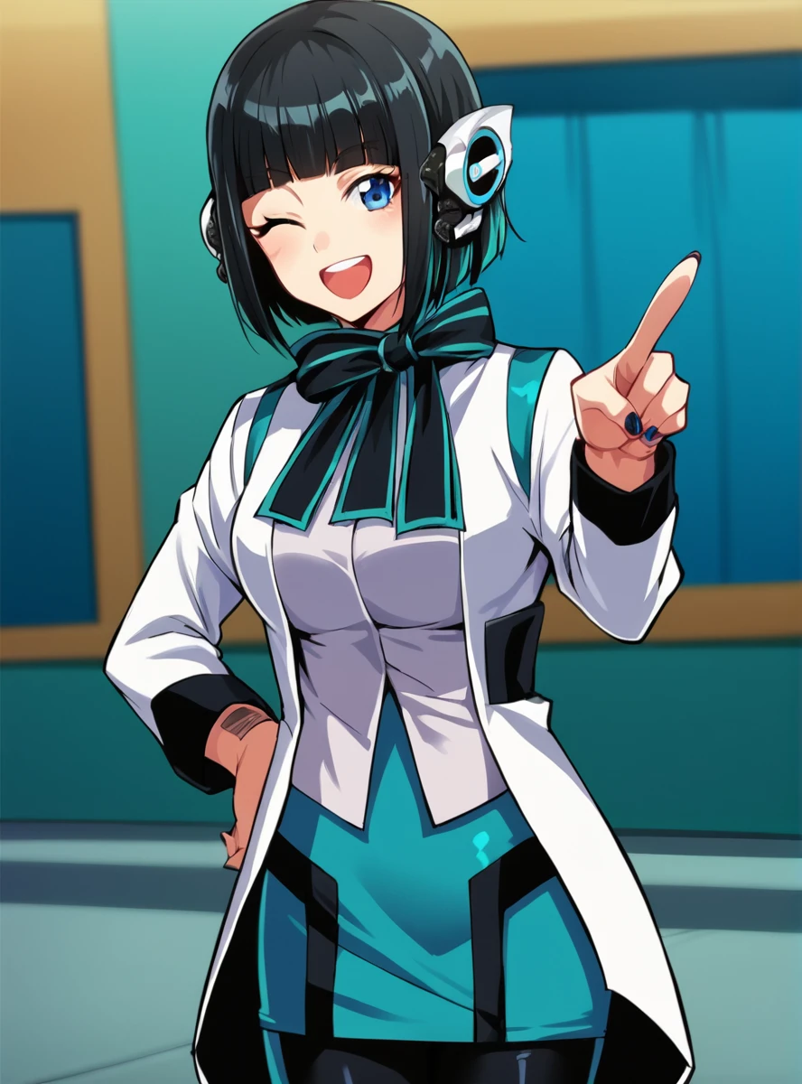 Prompts: black hair, short hair, robot ears, smile, jacket, blunt bangs, pantyhose, blue eyes, long sleeves, nail polish, white jacket, bow, boots,