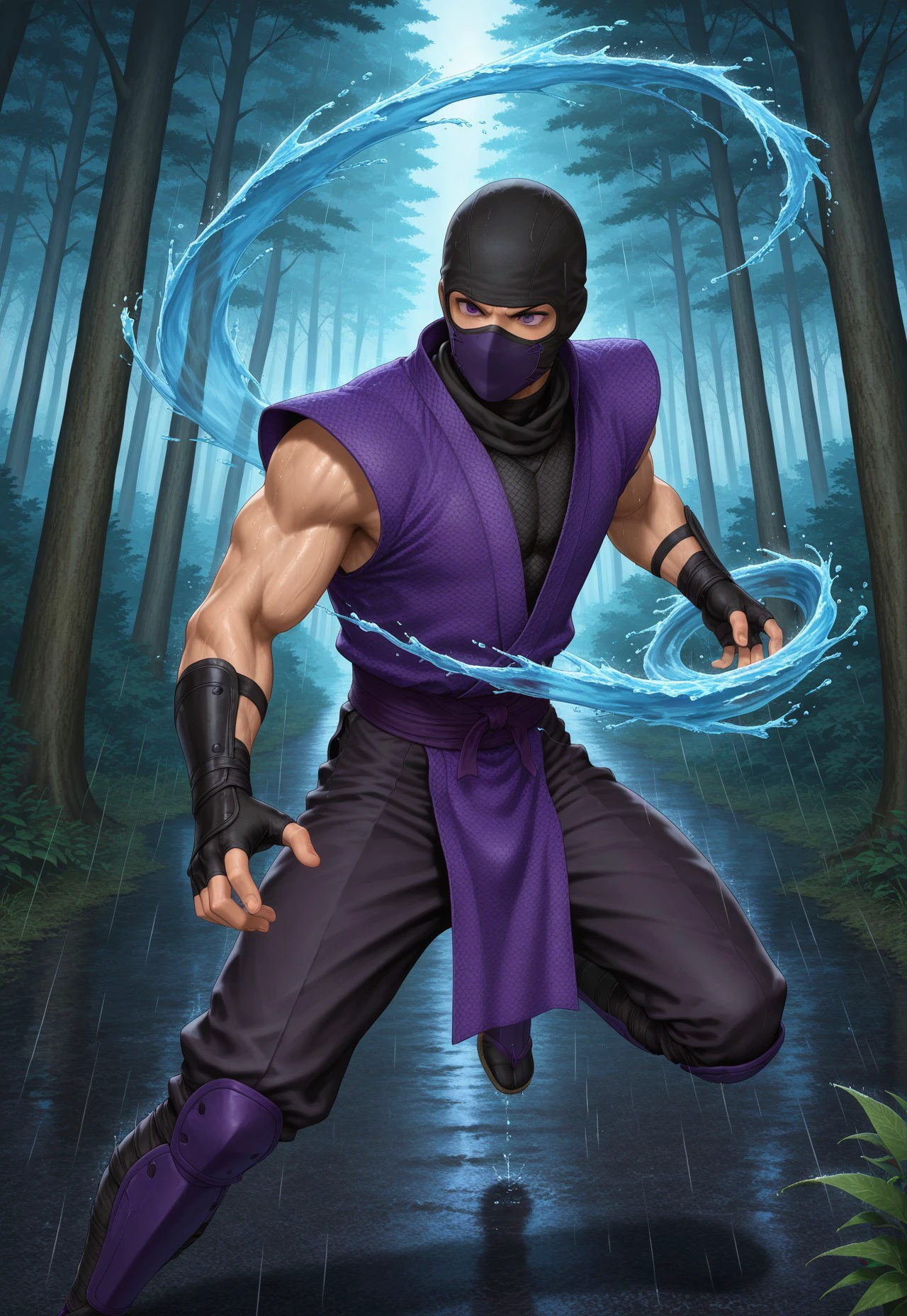Rain: 1boy, solo, purple ninja, mask, purple mouth mask, black balaclava, muscular, fingerless gloves, sleaveless