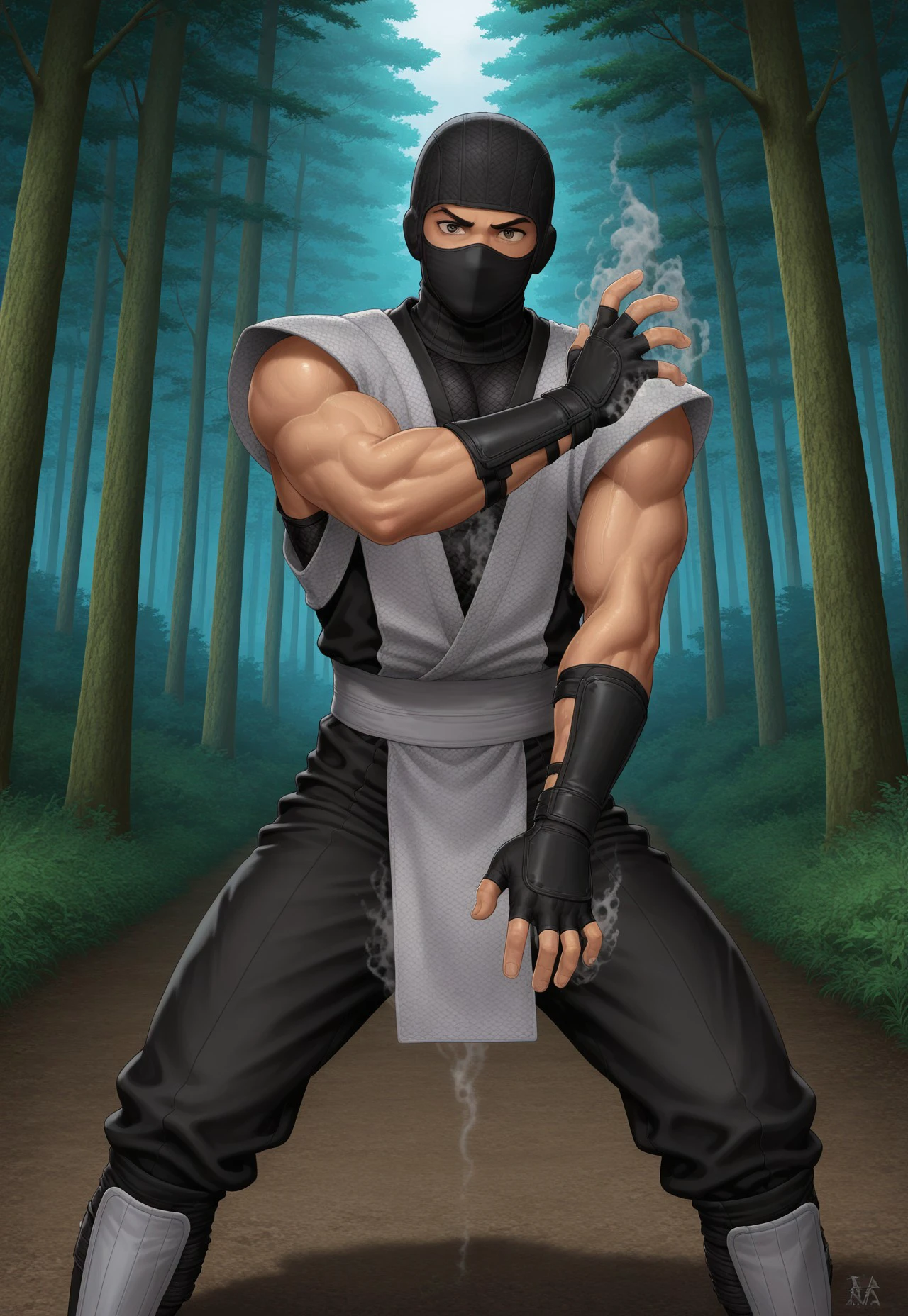 Smoke: 1boy, solo, ninja, mask, mouth mask, balaclava, muscular, fingerless gloves, sleaveless, klassicsmoke, whiteninja