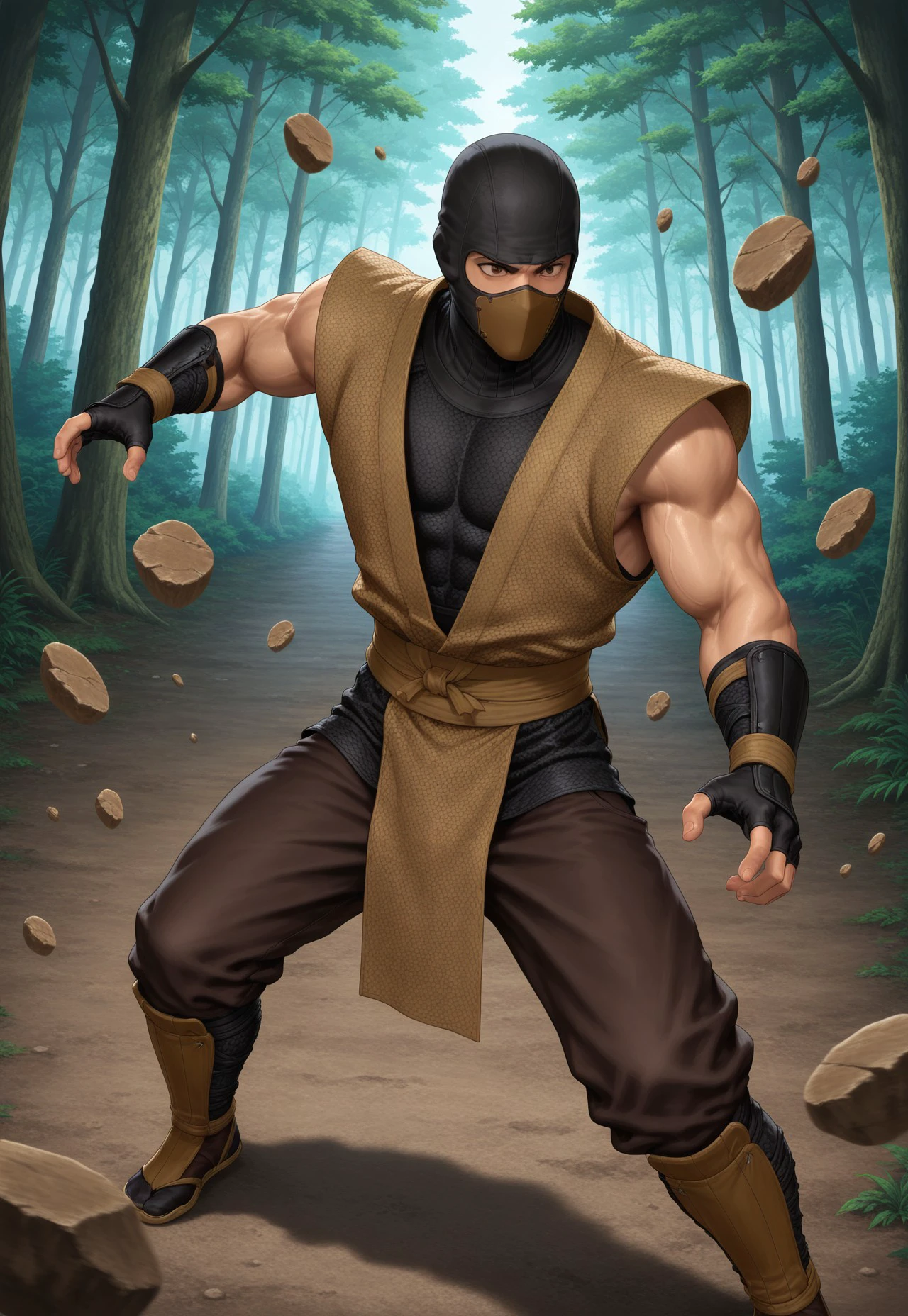 Tremor: 1boy, solo, brown ninja, brown mask, brown mouth mask, black balaclava, muscular, fingerless gloves, sleaveless