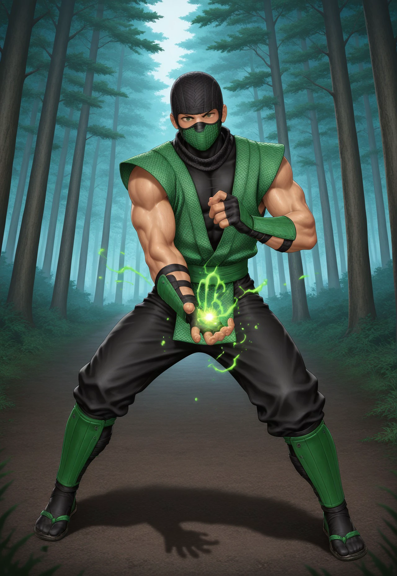 Reptile: 1boy, solo, ninja, mask, mouth mask, balaclava, muscular, fingerless gloves, sleaveless, greenninja