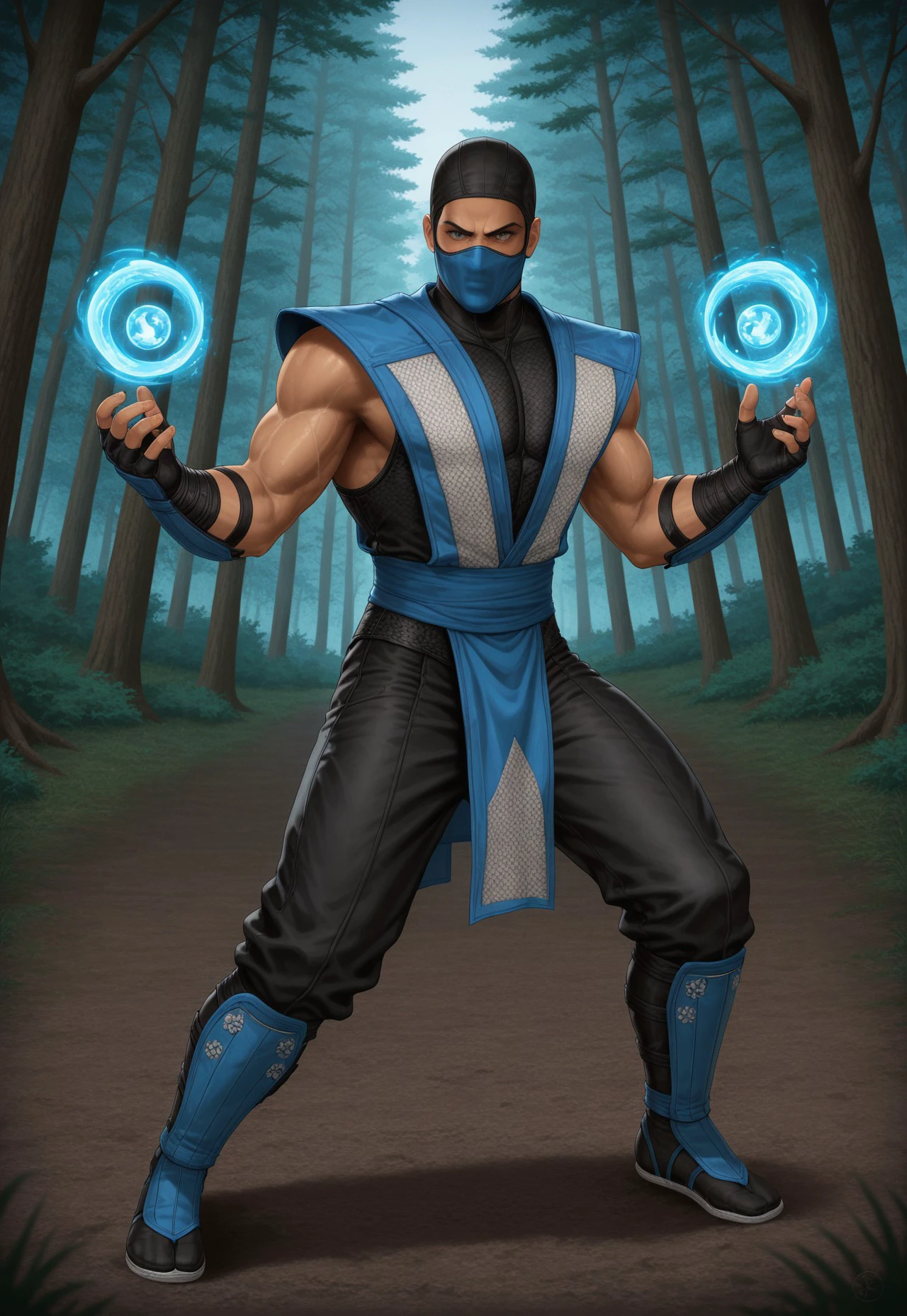 Sub-Zero: 1boy, solo, ninja, mask, mouth mask, balaclava, muscular, fingerless gloves, sleaveless, blueninja