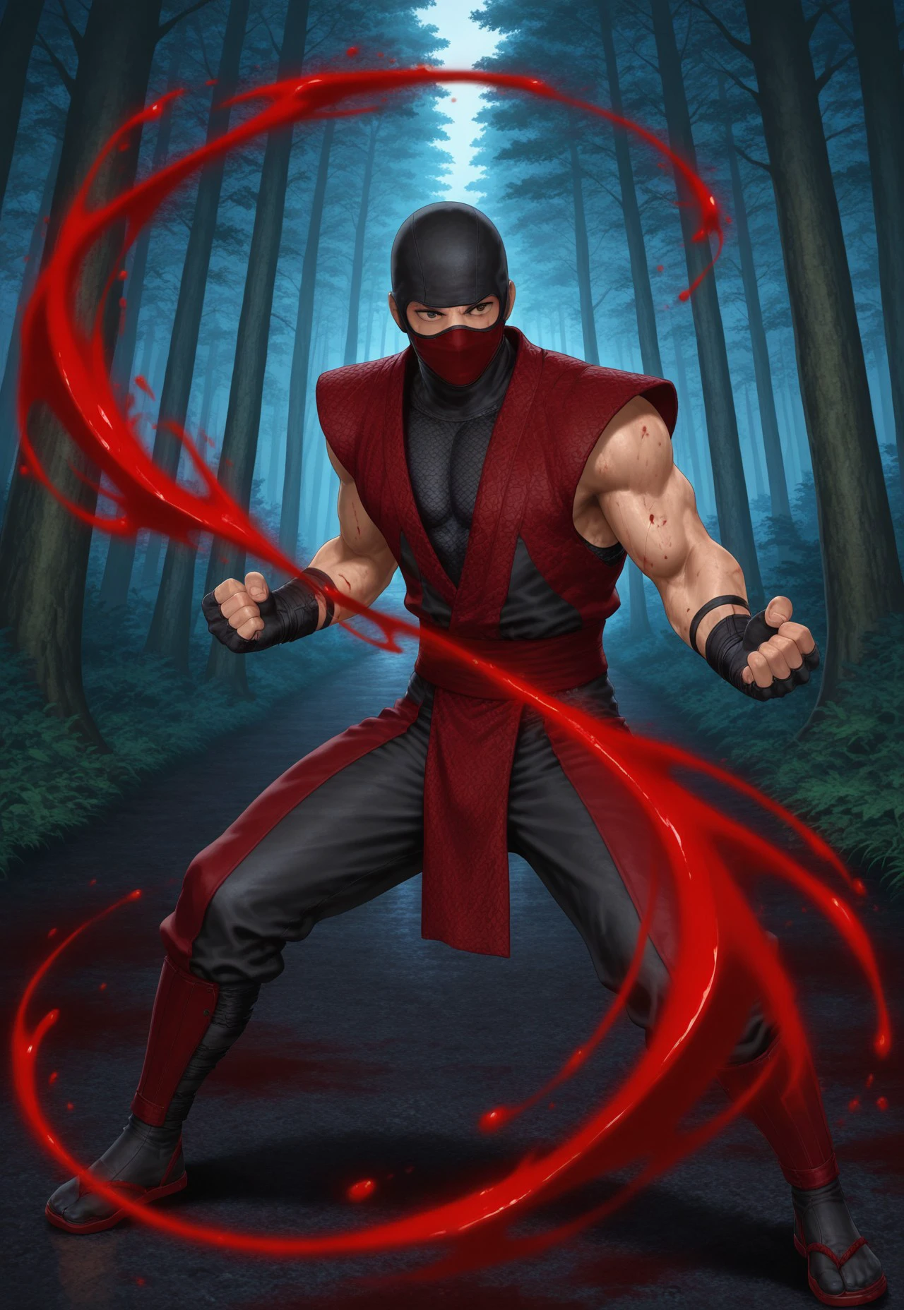 Scarlet: 1boy, solo, red ninja, mask, red mouth mask, black balaclava, muscular, fingerless gloves, sleaveless