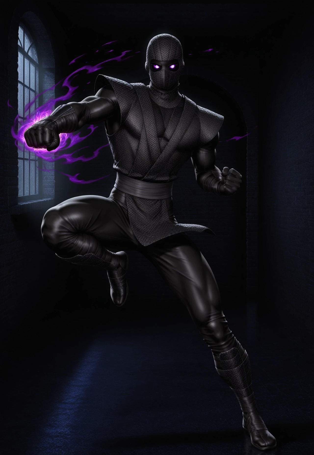Noob Saibot: 1boy, solo, ninja, mask, mouth mask, balaclava, muscular, gloves, bodysuit, bodysuit under clothes, blackninja, no face, purple pupils
