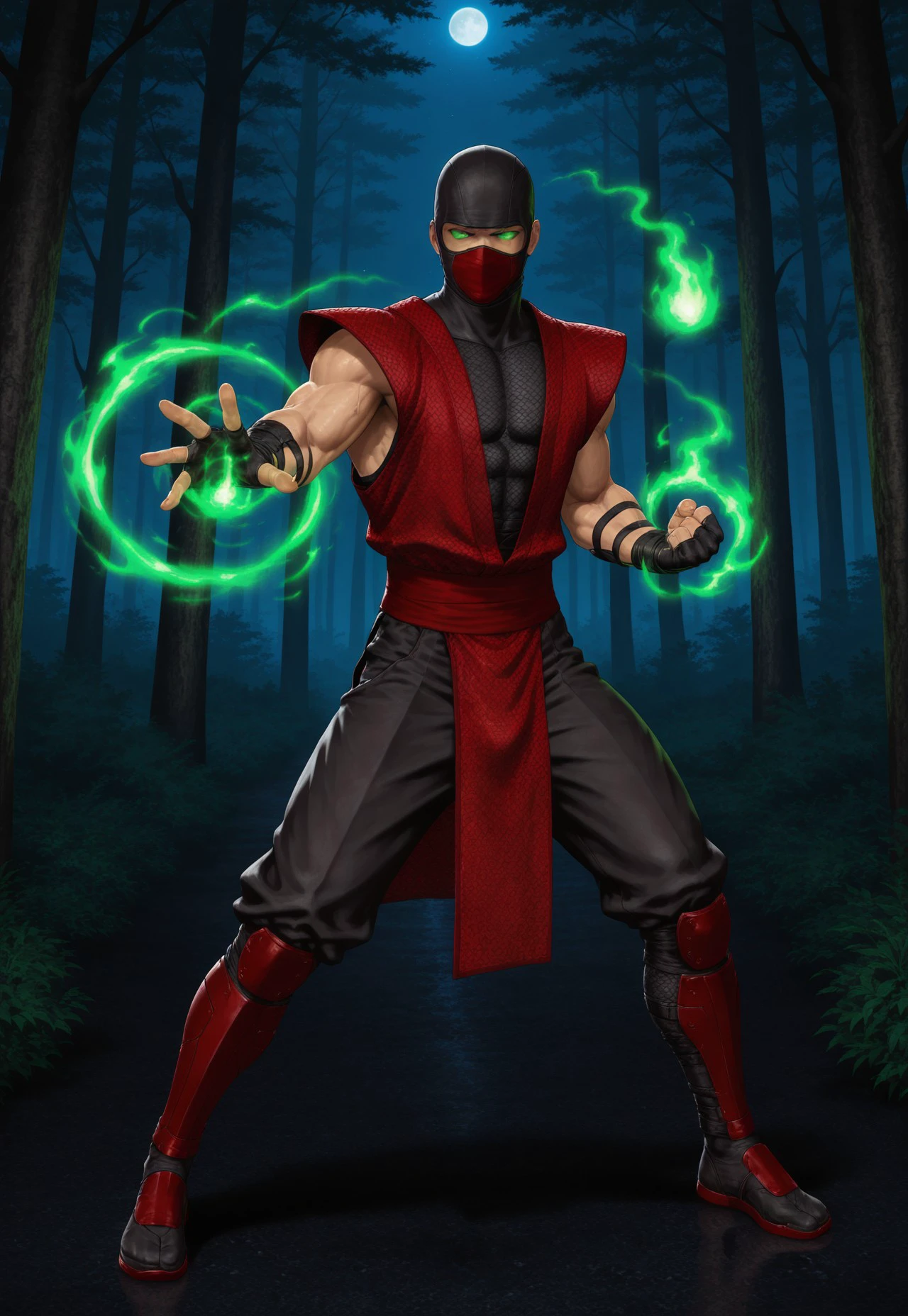 Ermac: 1boy, solo, ninja, mask, mouth mask, balaclava, muscular, fingerless gloves, sleaveless, redninja, no eyes, green eyes, glowing eyes