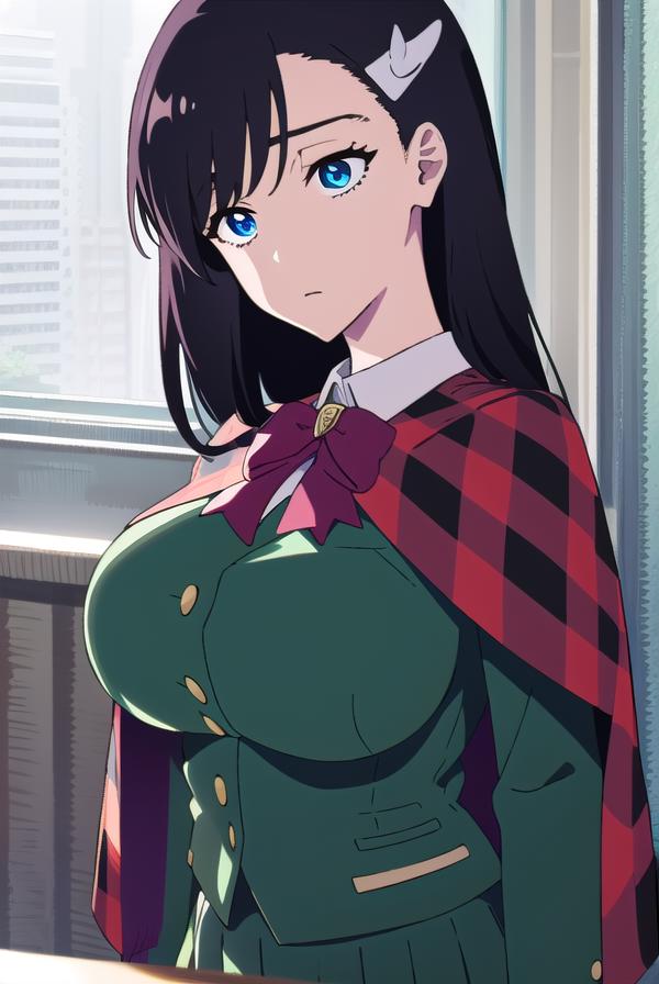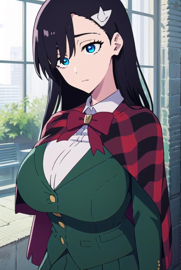 skirt, shirt, long sleeves, bow, school uniform, jacket, white shirt, pleated skirt, collared shirt, bowtie, red bow, plaid, capelet, blazer, green skirt, green jacket,