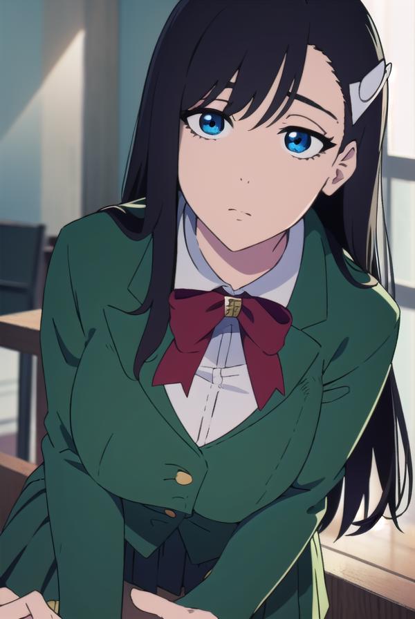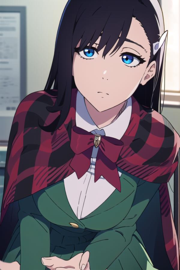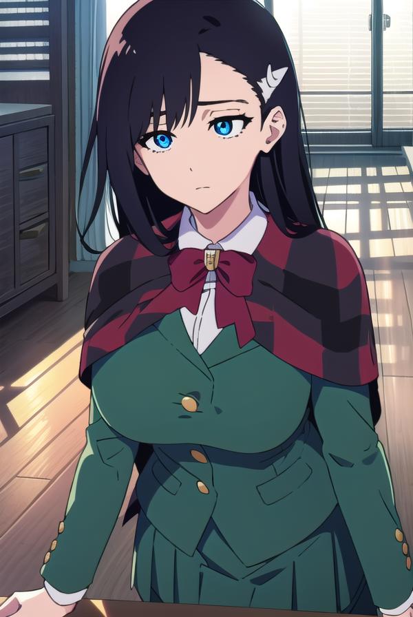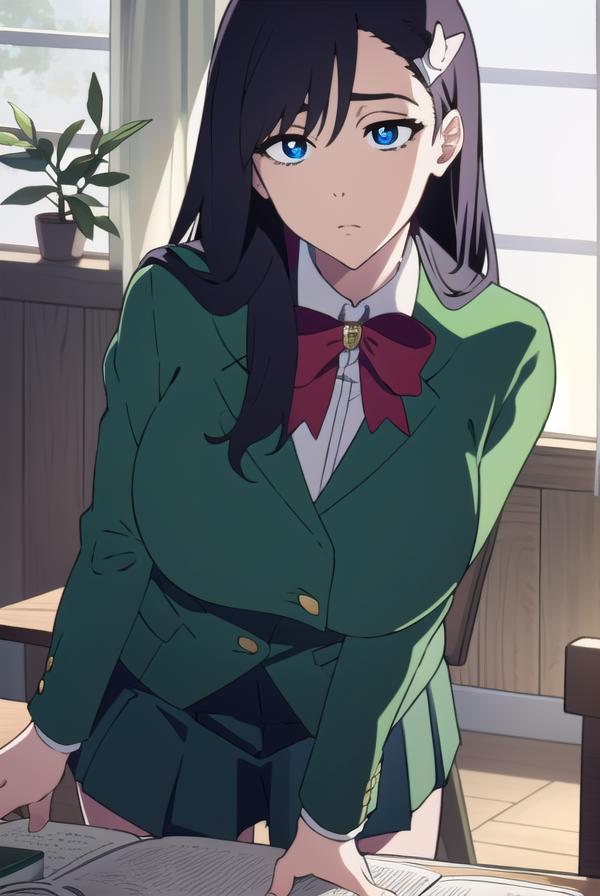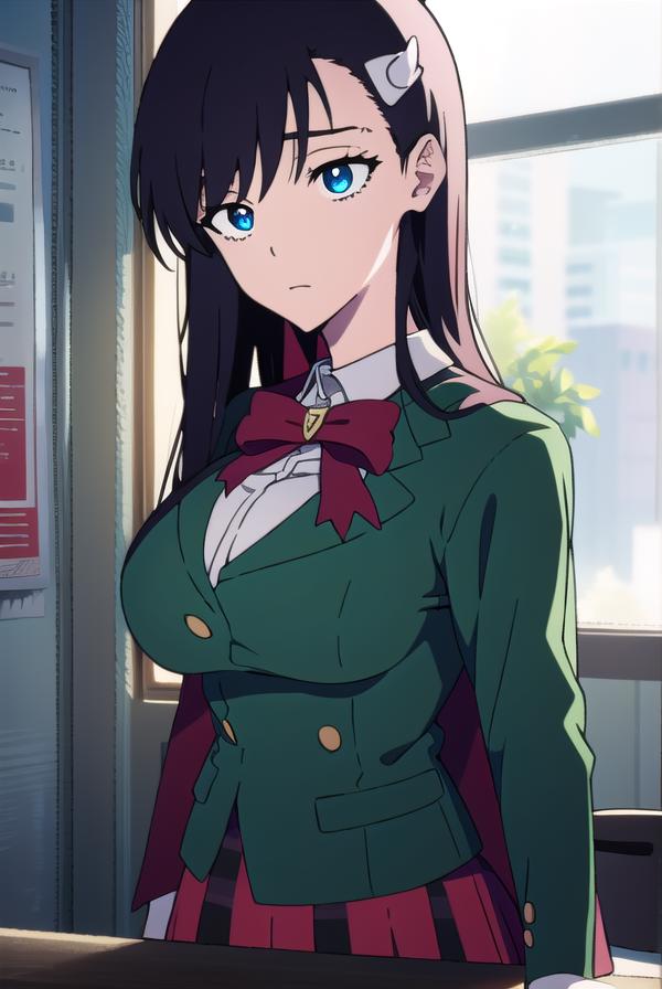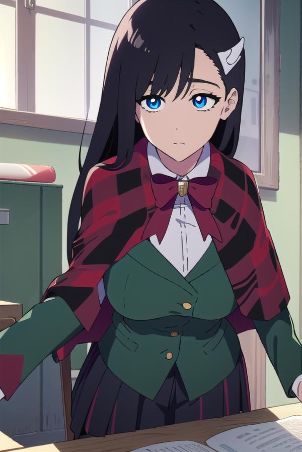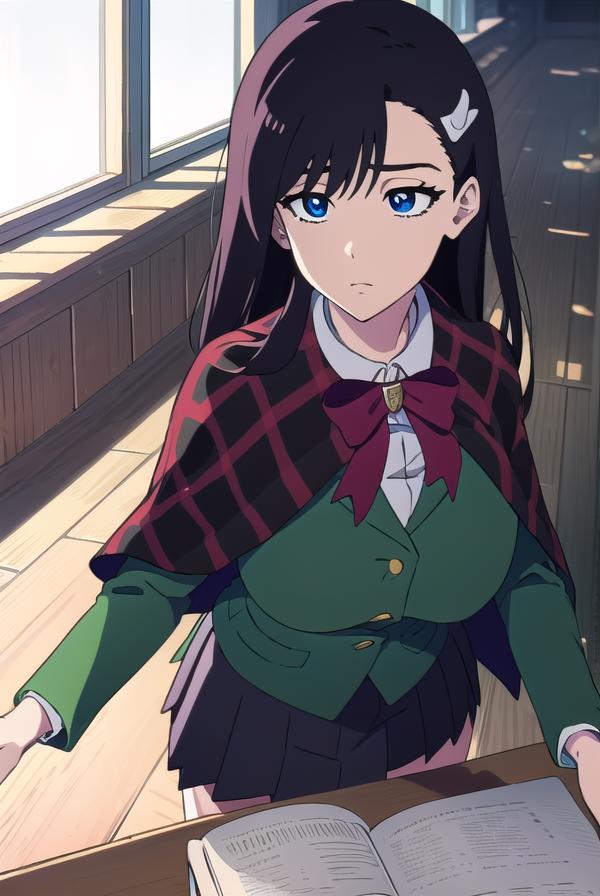 noel niihashi long hair, blue eyes, black hair, hair ornament, hairclip,