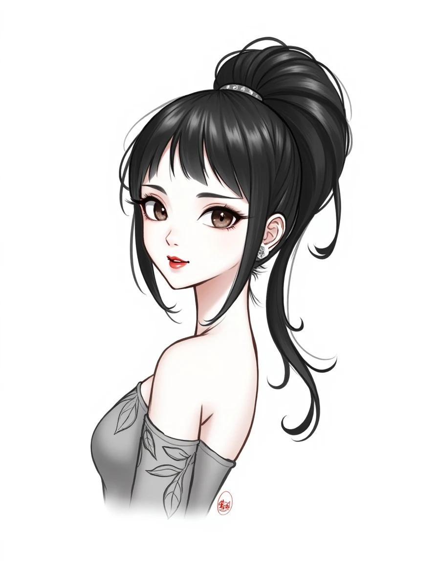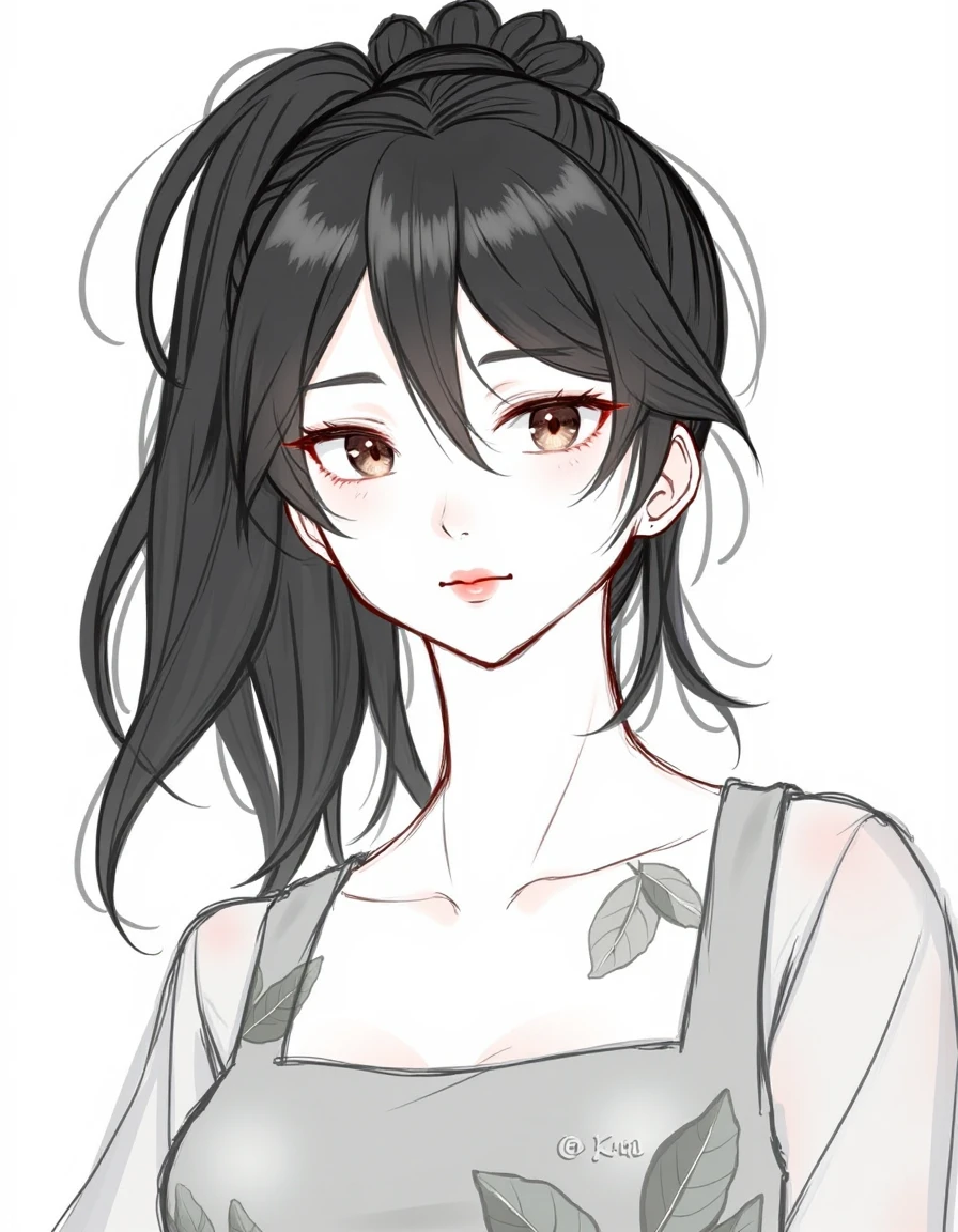2 shouhui, A drawing of a woman. The woman has long hair. The hair is in a ponytail. The ponytail is black. The drawing is done in black and white. There is a gray dress on the woman. There are leaves on the dress. The face of the woman is white. Her lips are red. Her eyebrows are black. Her eyes are brown.