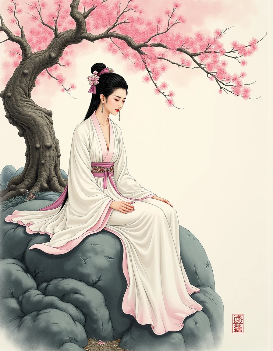 1 shouhui, A drawing of a woman is shown. She has long dark hair that is pulled back into a ponytail. She is wearing a white robe. There is a branch with leaves on it behind her.