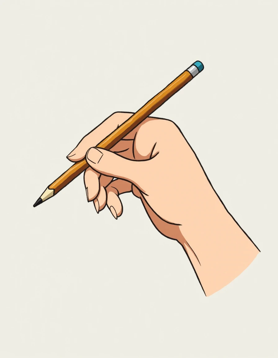 3 shouhui, A hand is holding a pencil. The hand is drawn in a cartoonish style. The pencil is pointy. There is a bluish color on the arm of the hand.
