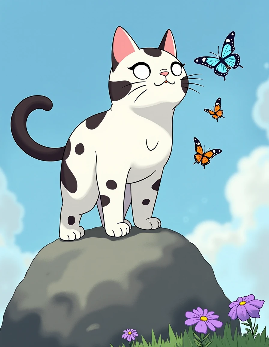4 shouhui, A white cat with black spots is standing on top of a rock. There are several colorful butterflies flying around the cat. There is purple flowers on the ground next to the rock.