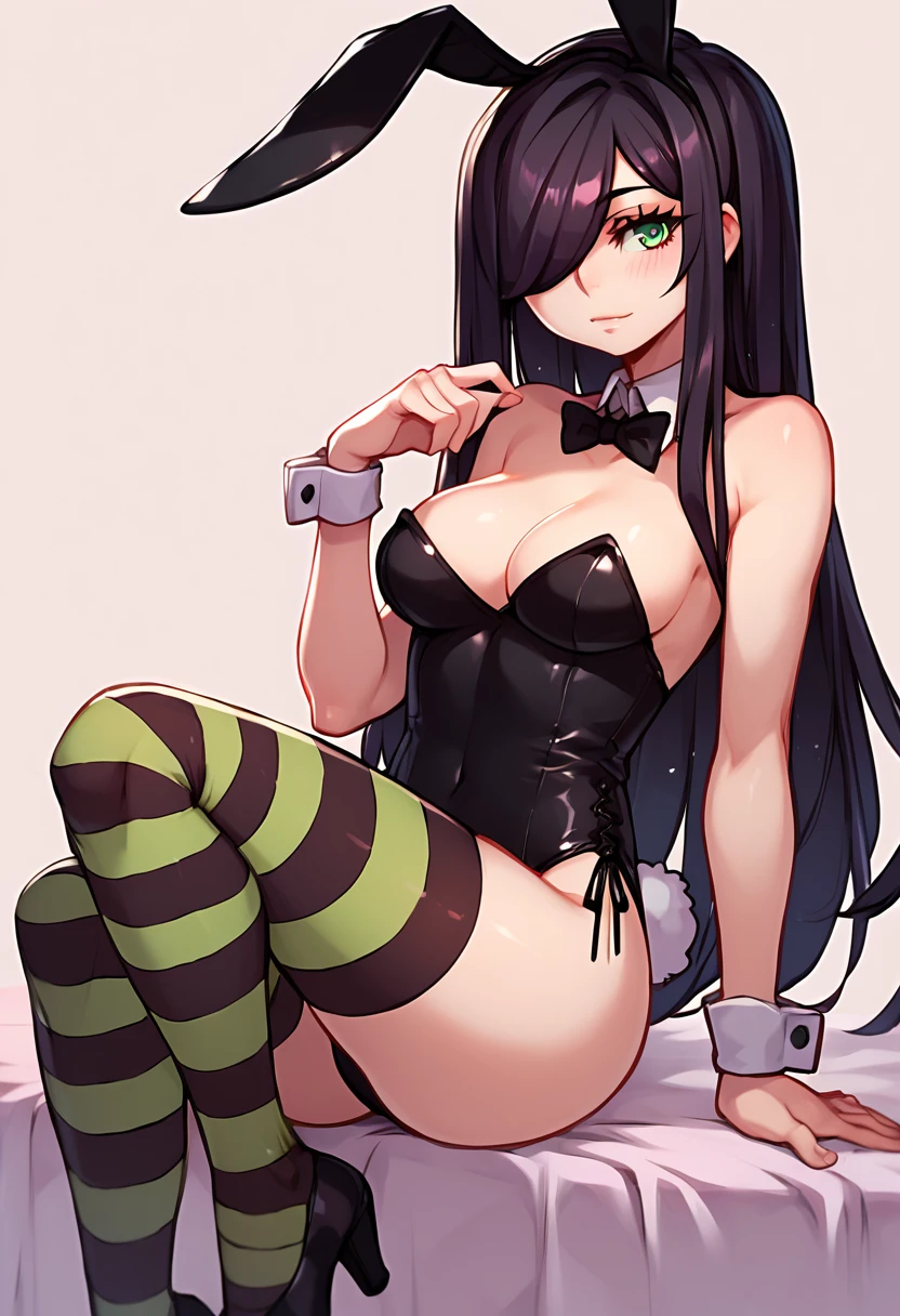 black hair, long hair, hair over one eye, green eyes, striped scarf, fishnet sleeves, black tank top, black skirt, striped thighhighs, 1girl,