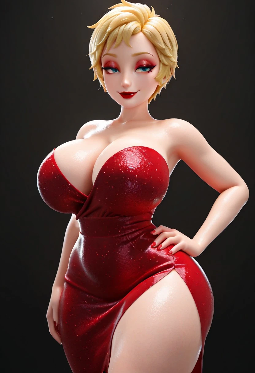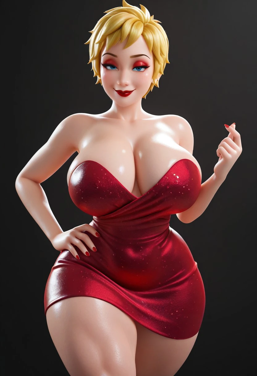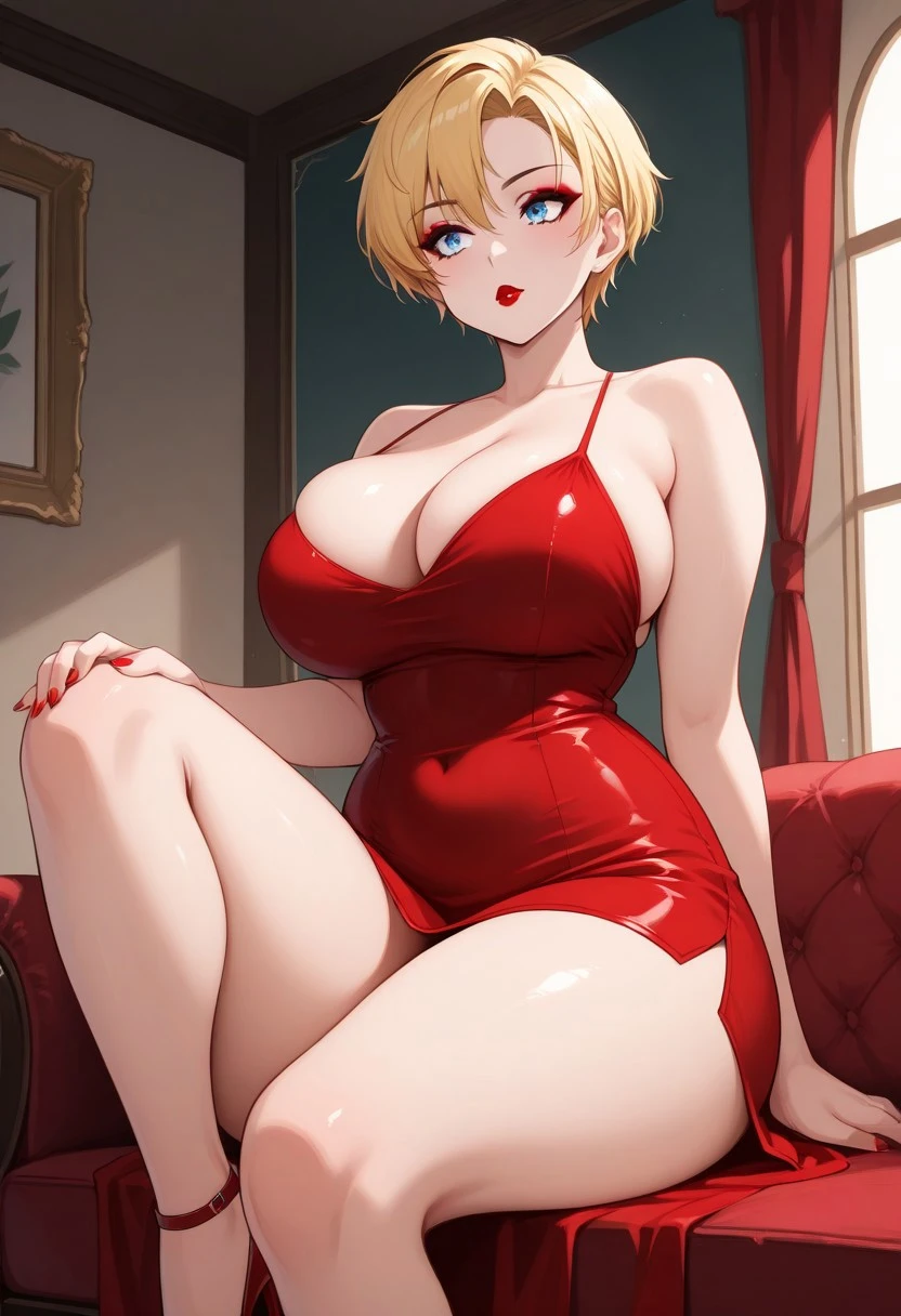 blonde hair, blue eyes, short hair, makeup, red lipstick, red dress