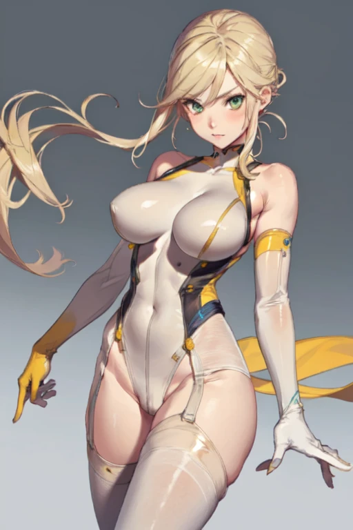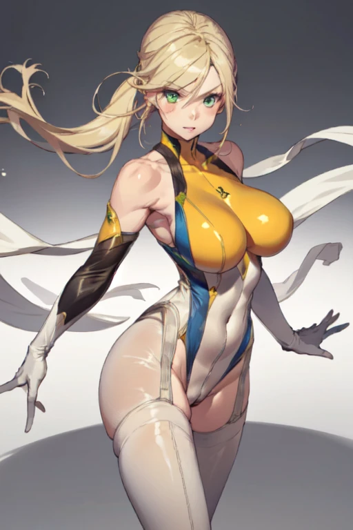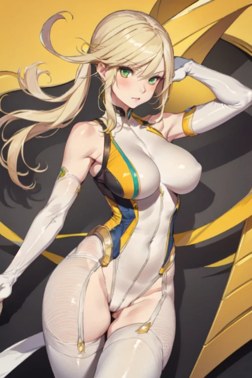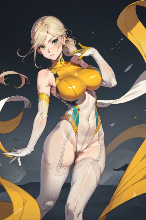 DenkaSF, 1girl, solo, long hair, low ponytail blonde hair, large breasts, thighhighs, elbow gloves, bare shoulders, green eyes, white gloves, highleg leotard, skin tight, impossible clothes, yellow bodysuit