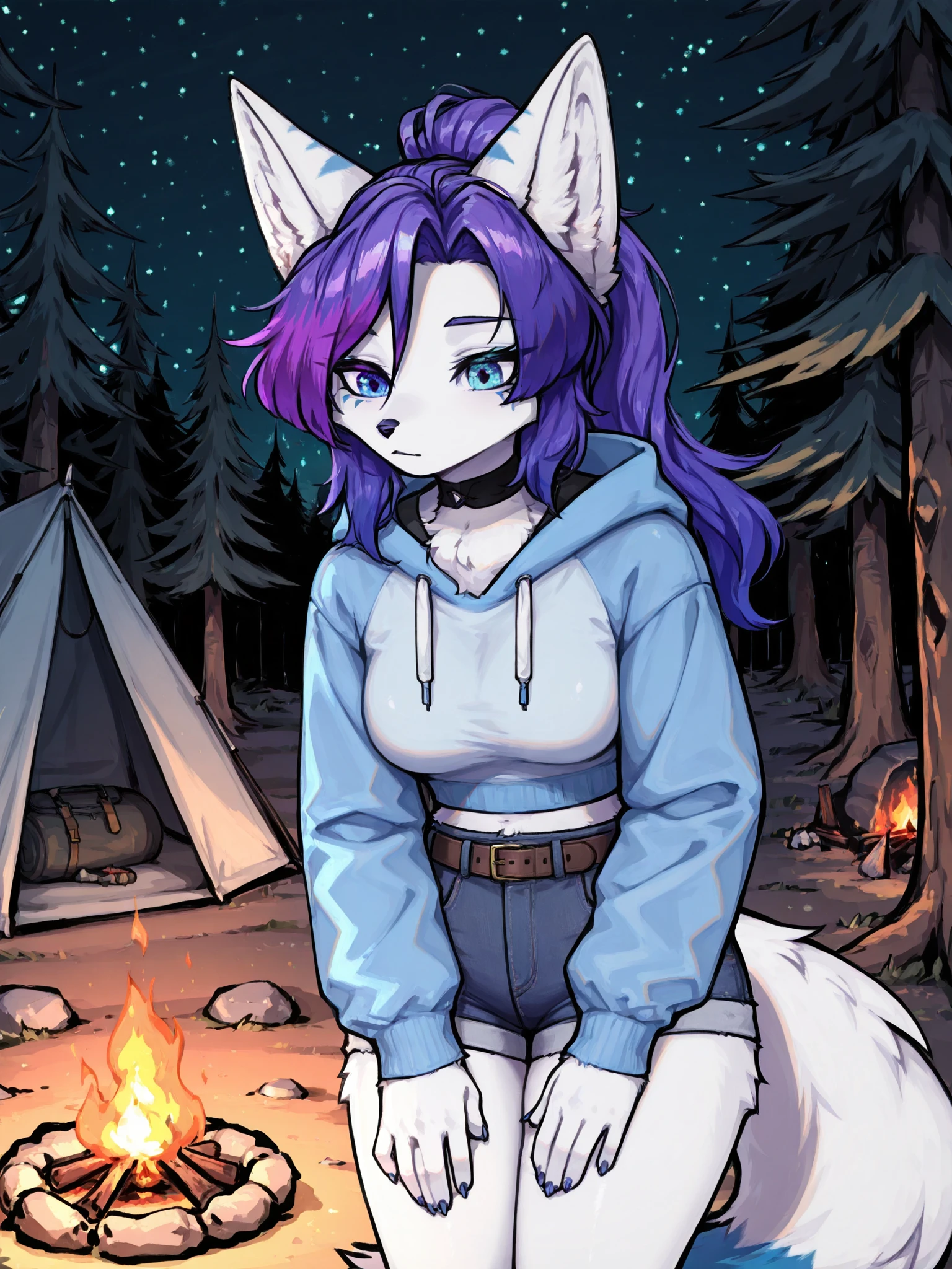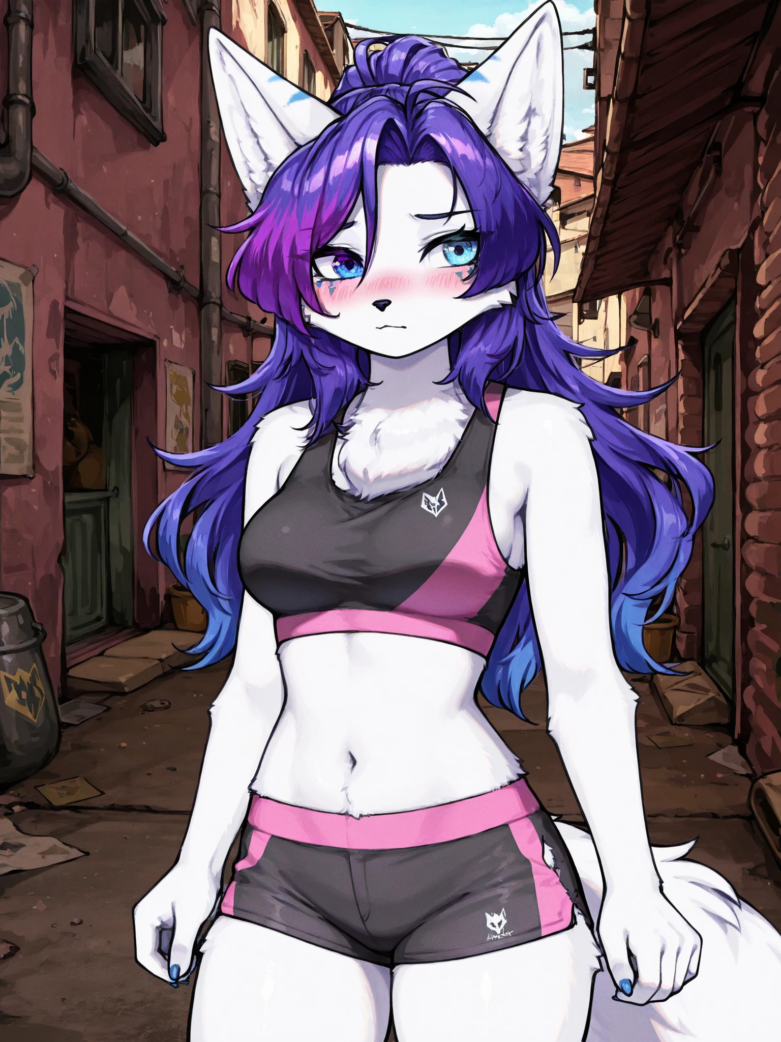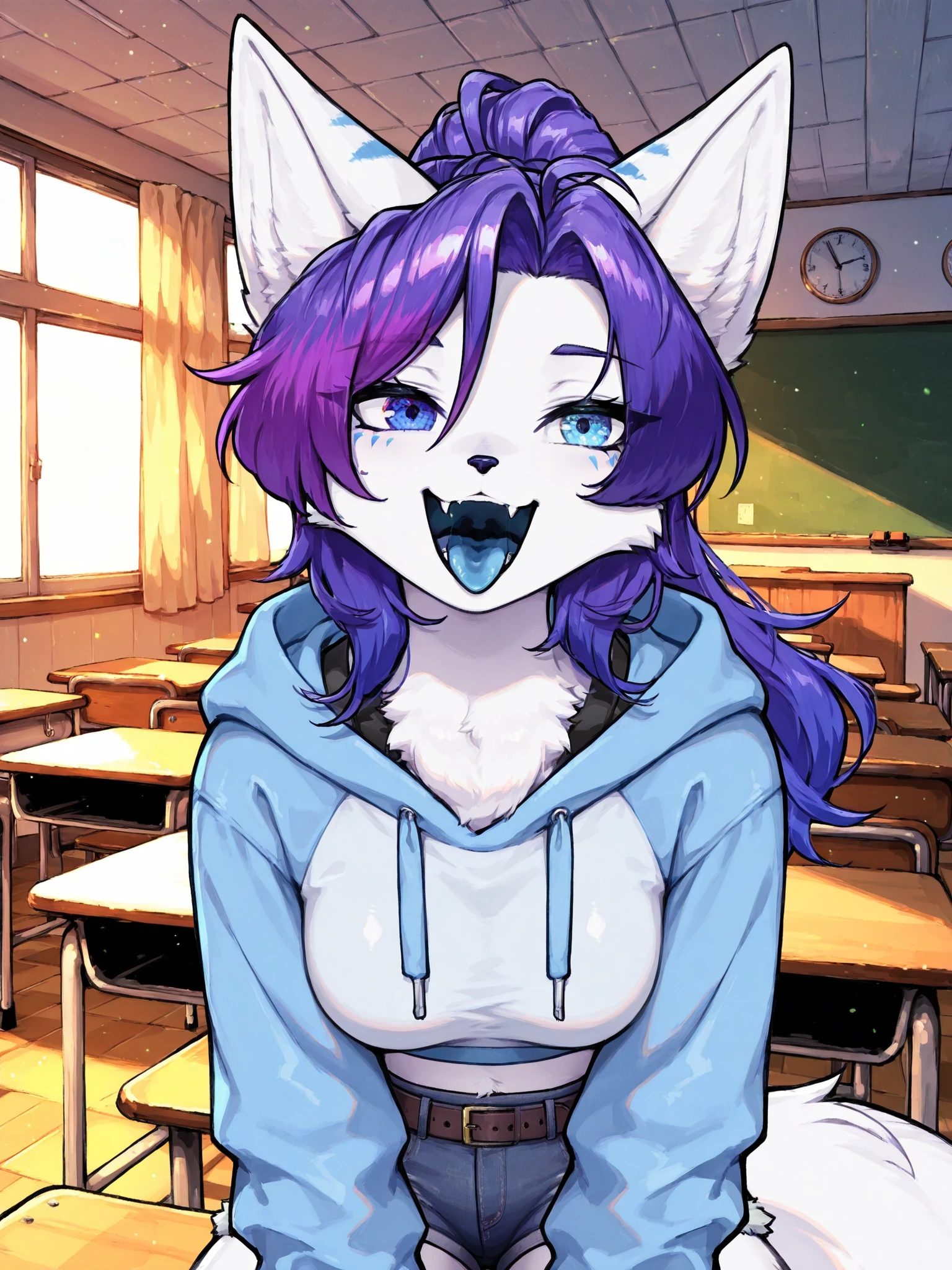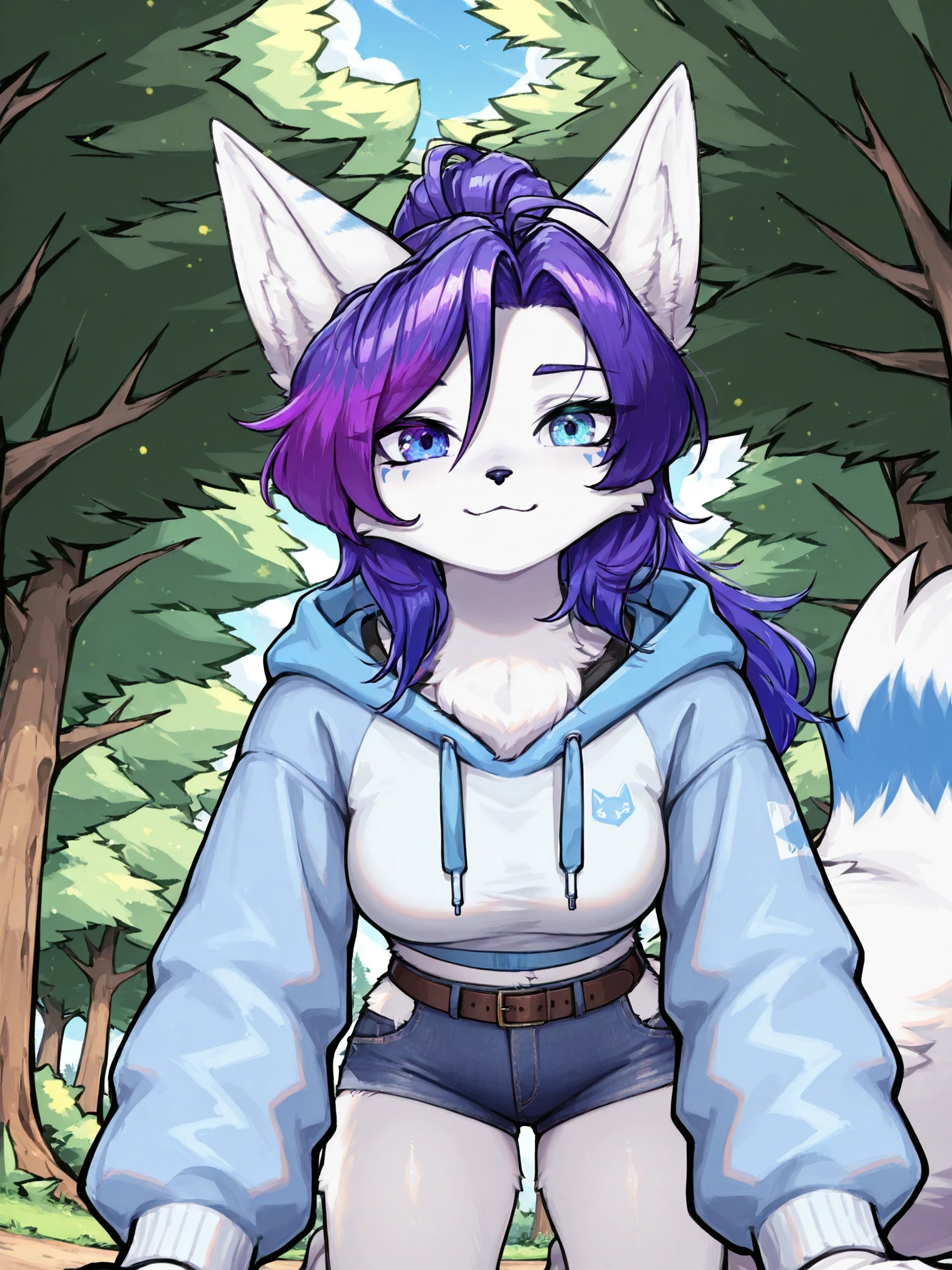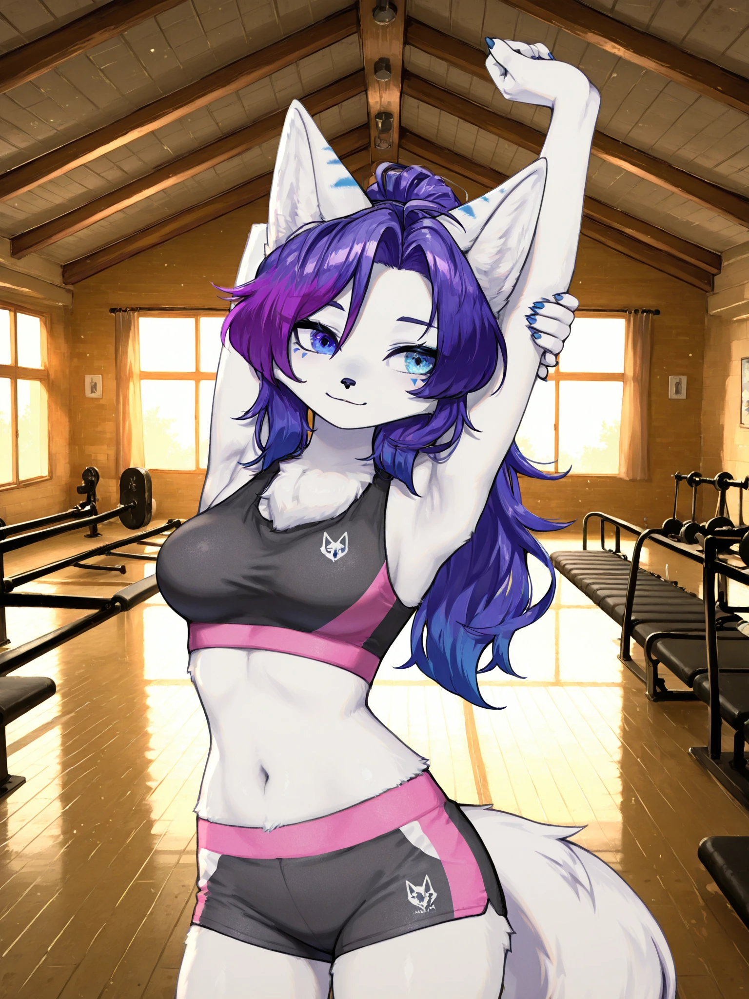 General: 1girl, solo, furry, furry female, fox girl, body fur, white fur, two-tone fur, animal ears, animal ear fluff, fox ears, animal nose, long hair, multicolored hair, two-tone hair, blue hair, purple hair, heterochromia, blue eyes, breasts, medium breasts, nail polish, blue nails, tail, fox tail