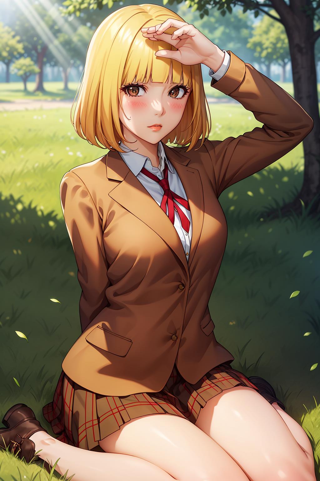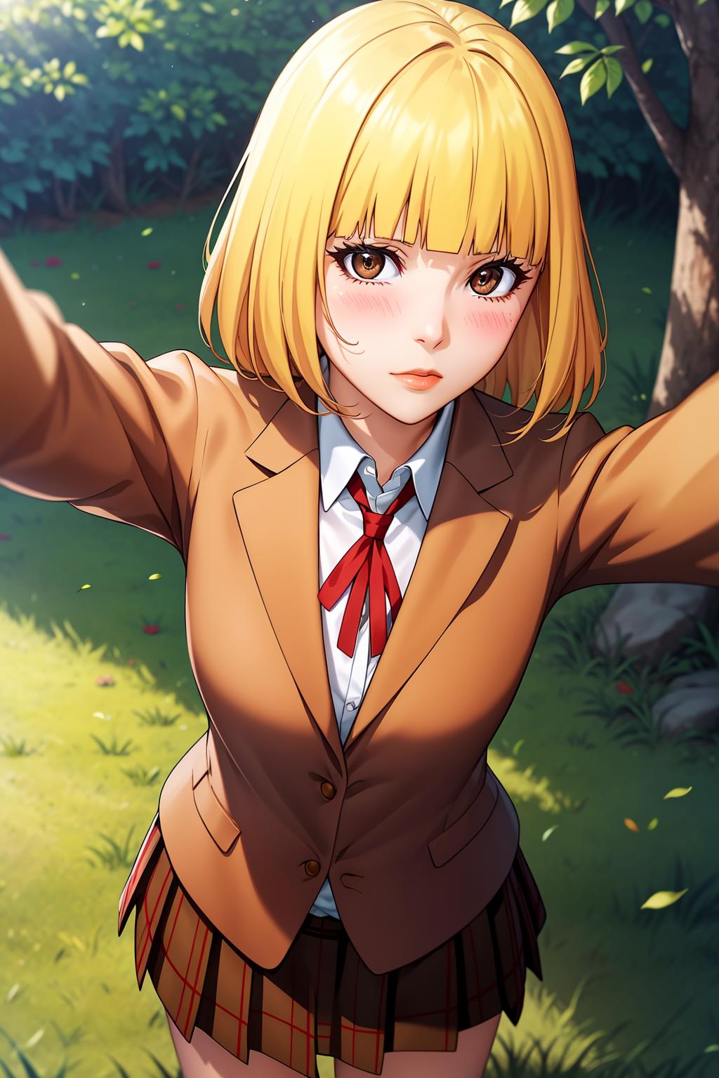 HnMdrkw-KJ , brown eyes , brown jacket, collared shirt, neck ribbon, plaid skirt, school uniform