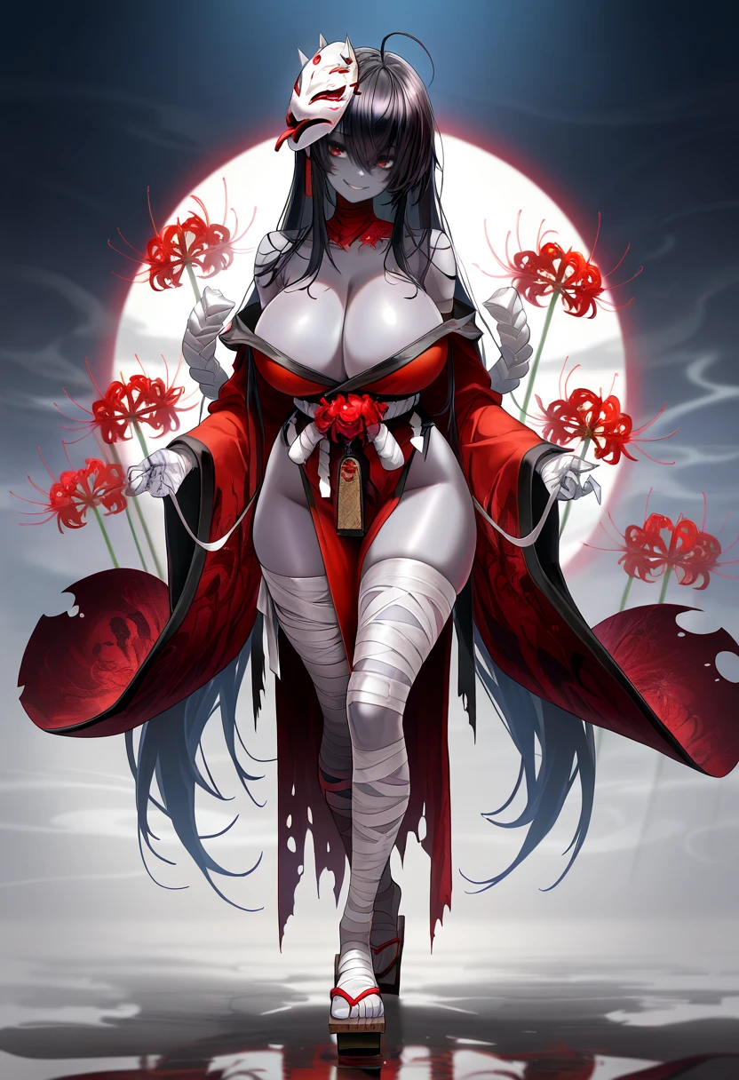 very long hair, black hair, ahoge, red eyes, hair over one eye, huge breasts, off shoulder kimono, red kimono, black trim, torn kimono, bandaged arm, cleavage, grey skin, sinister smile, mask on head,