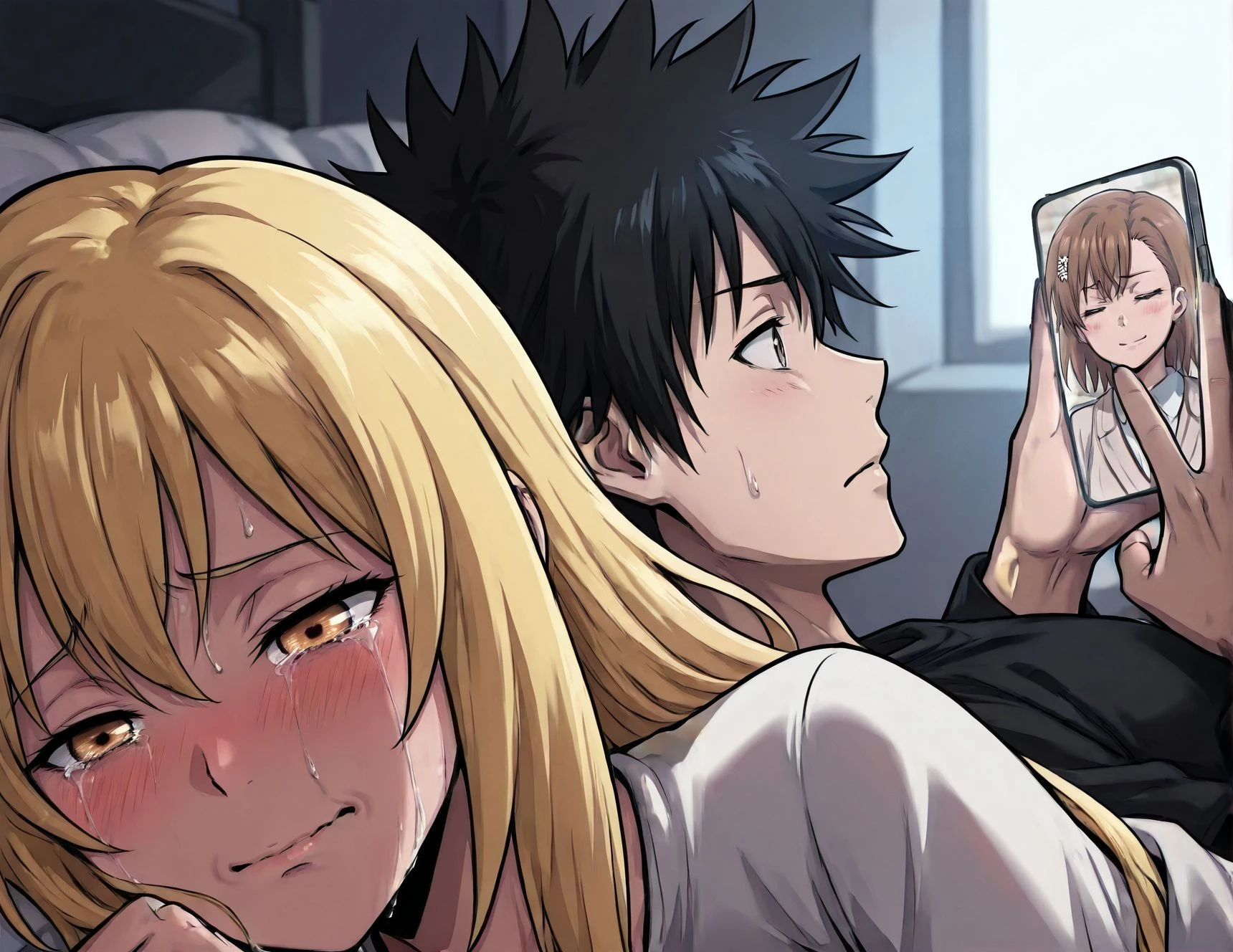 smartphone screen visible, photo of another smile girl on screen, (lying male),