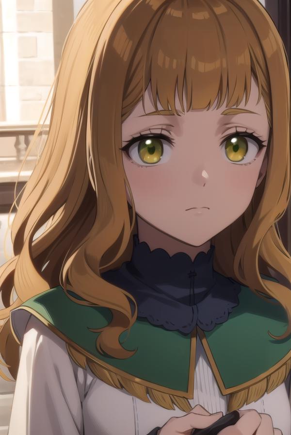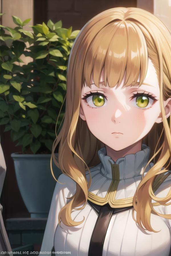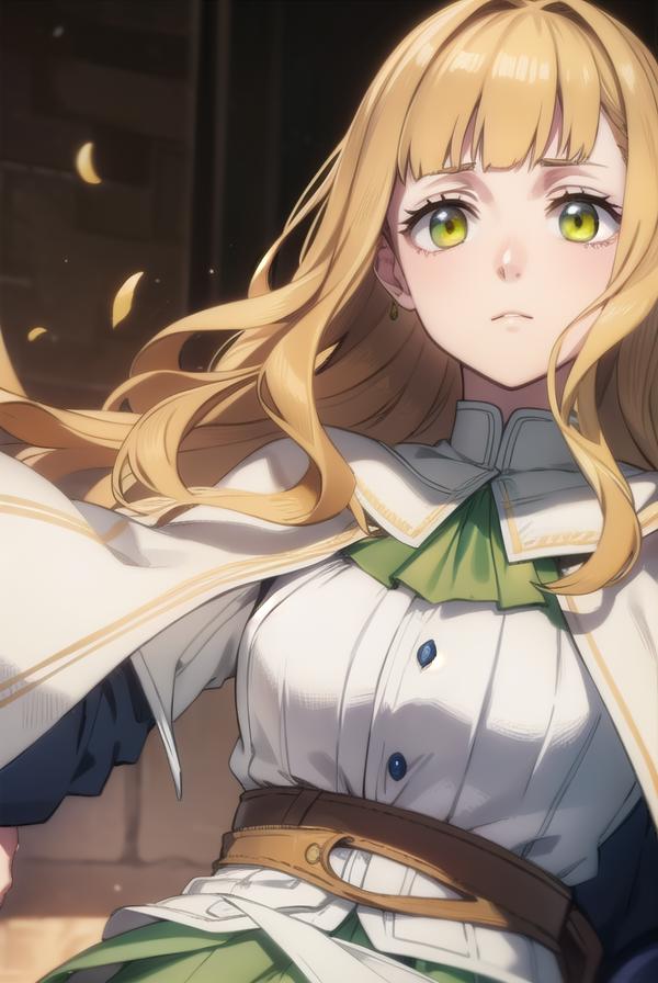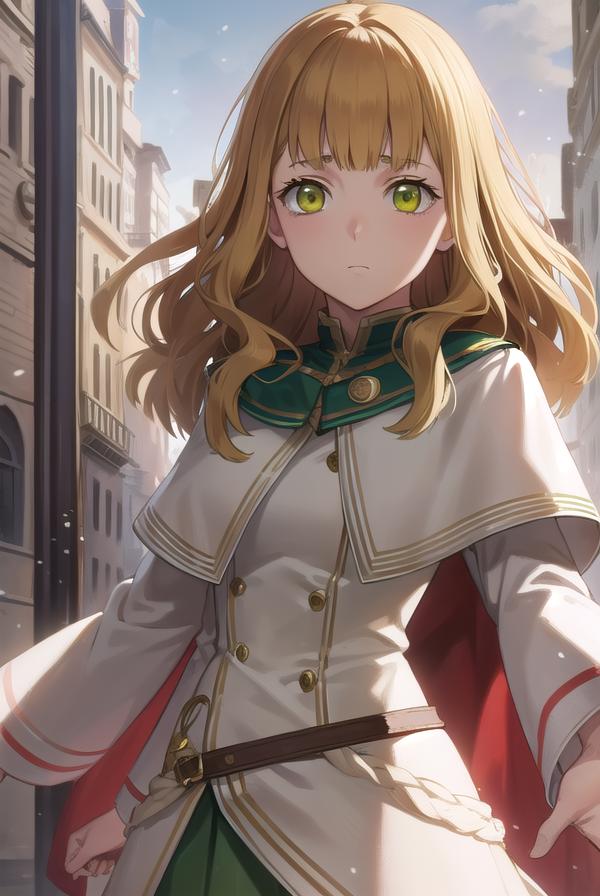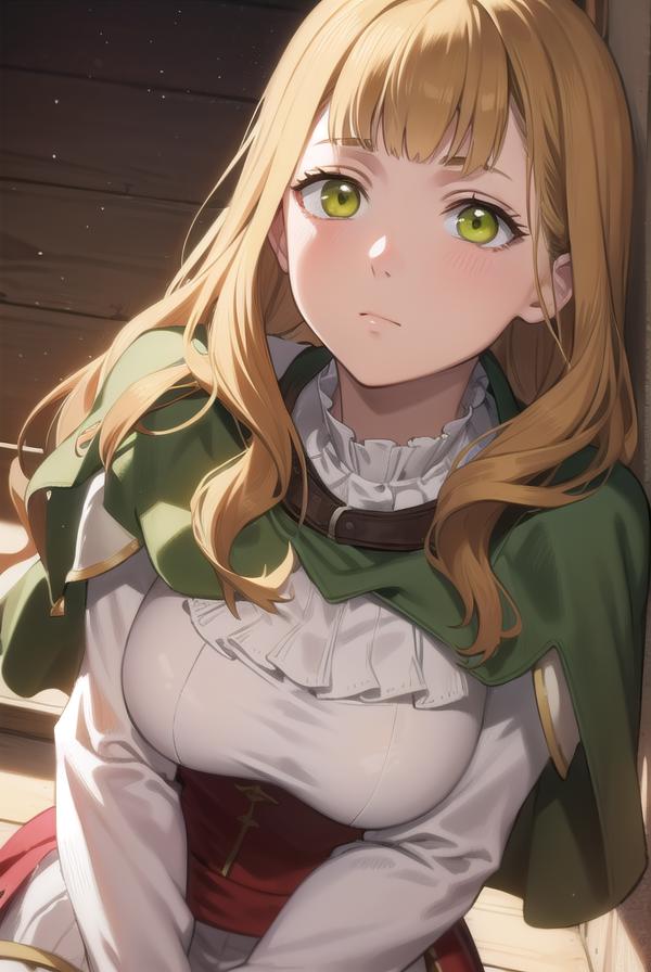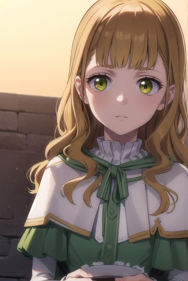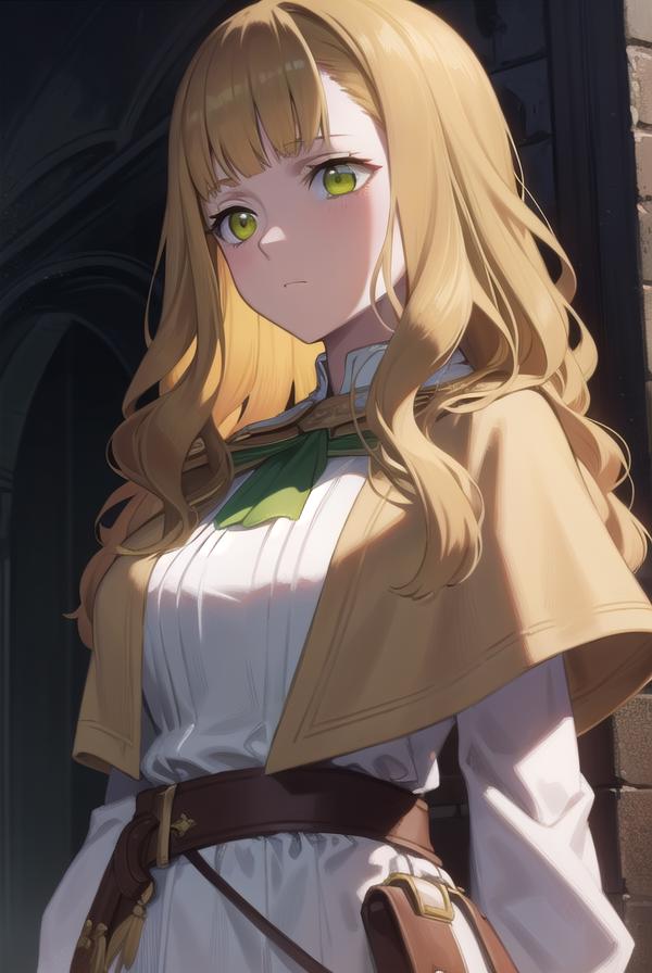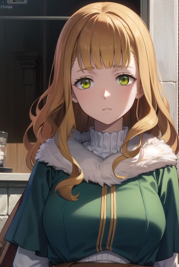 mimosa vermillion, brown hair, (green eyes:1.5), blunt bangs, bangs, medium hair, wavy hair,