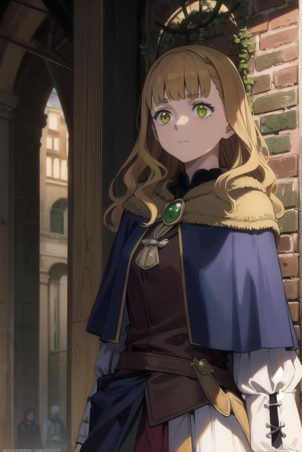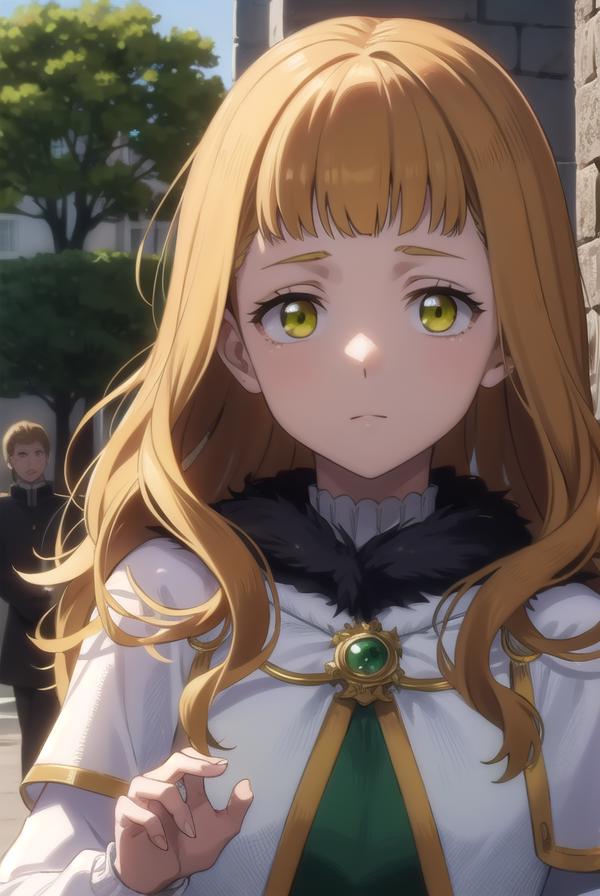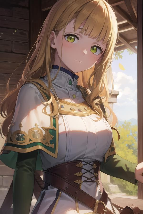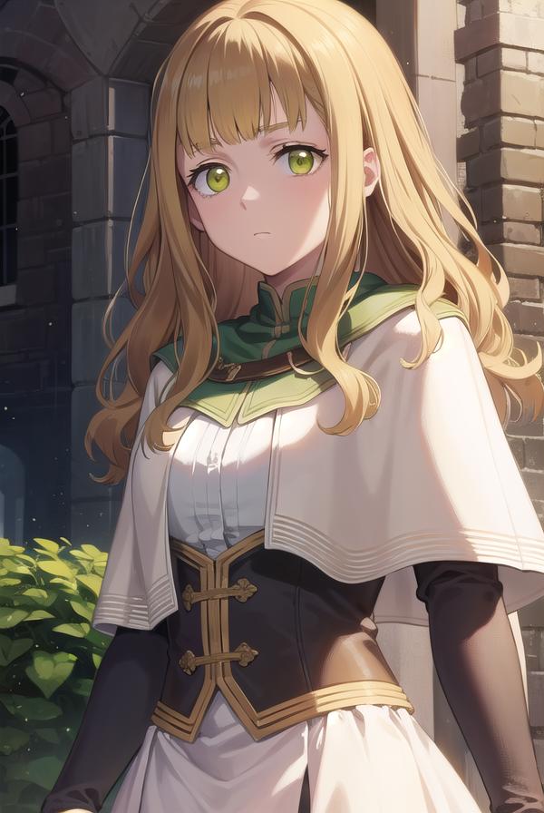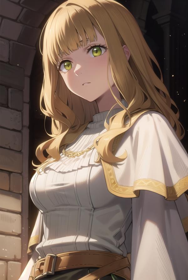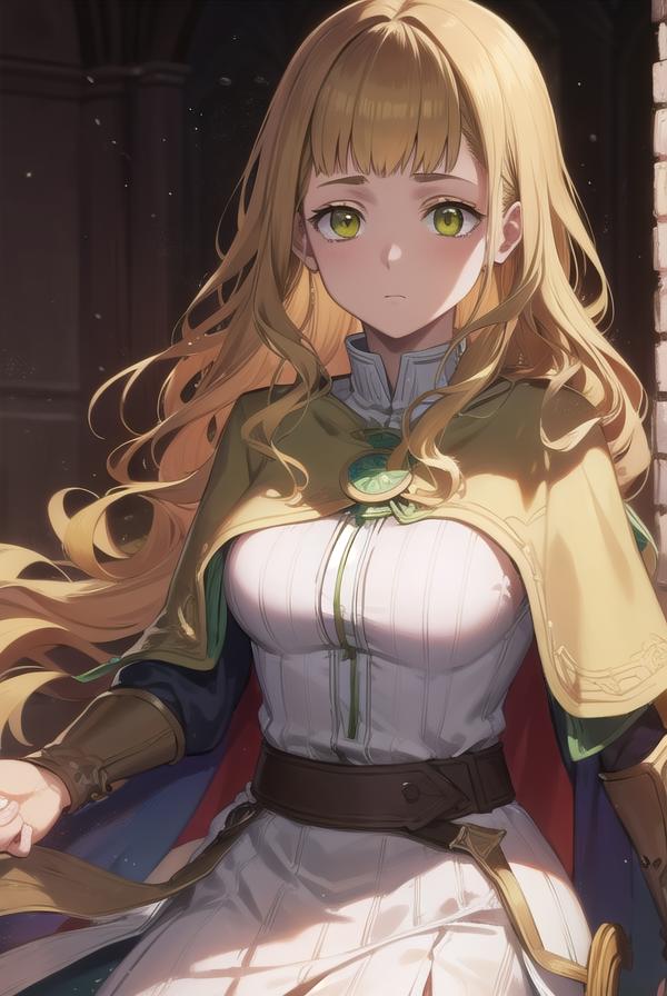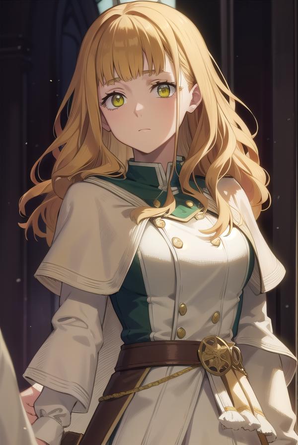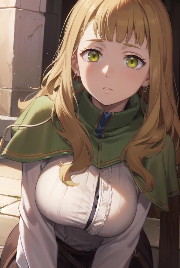 mimosa vermillion, brown hair, (green eyes:1.5), blunt bangs, bangs, medium hair, wavy hair,