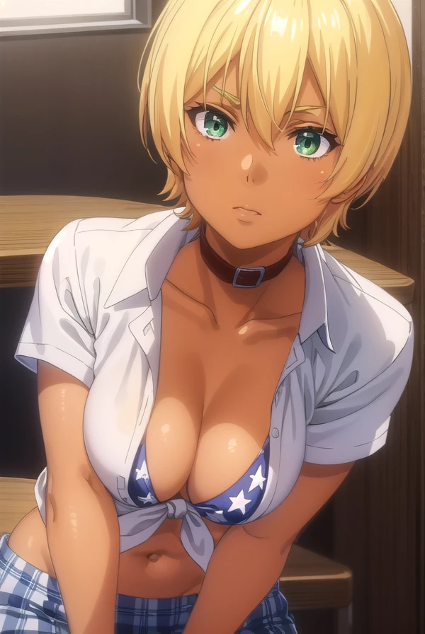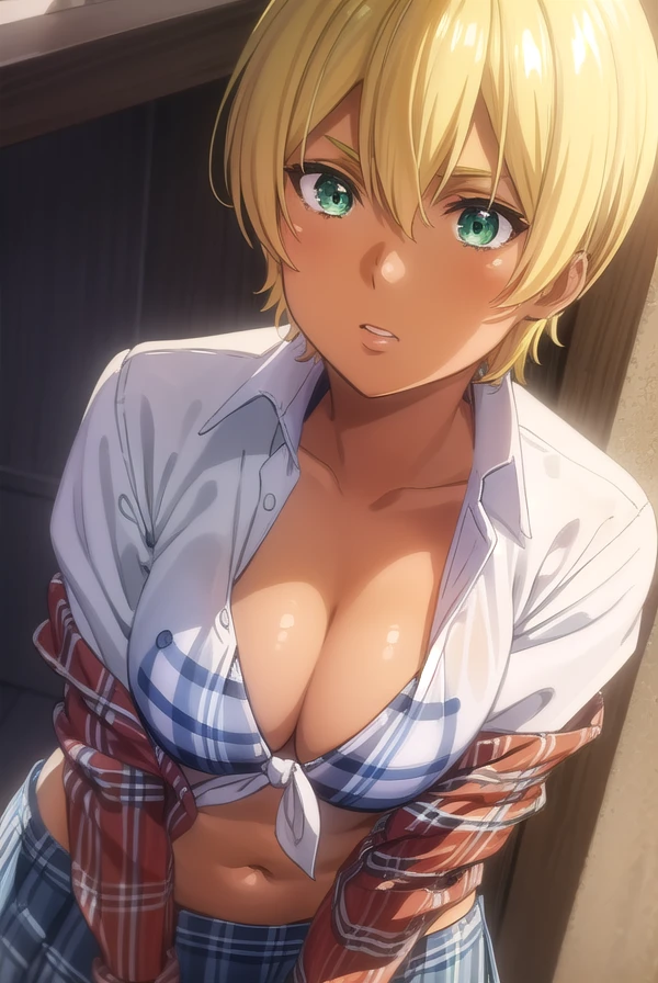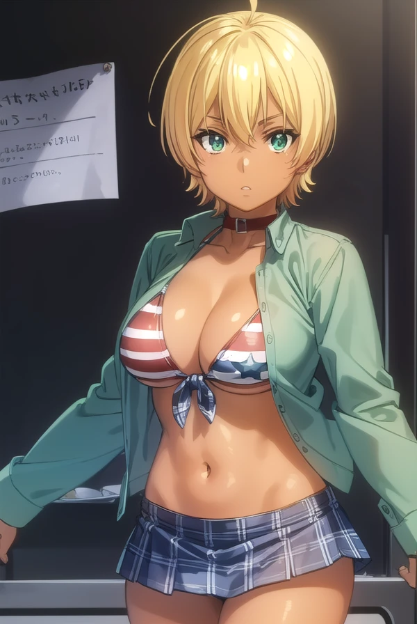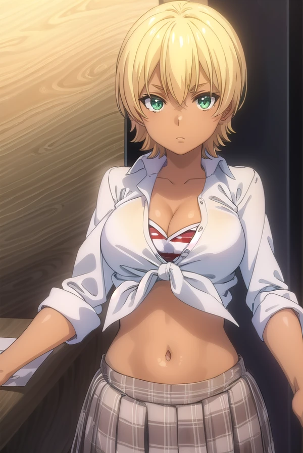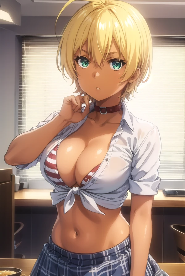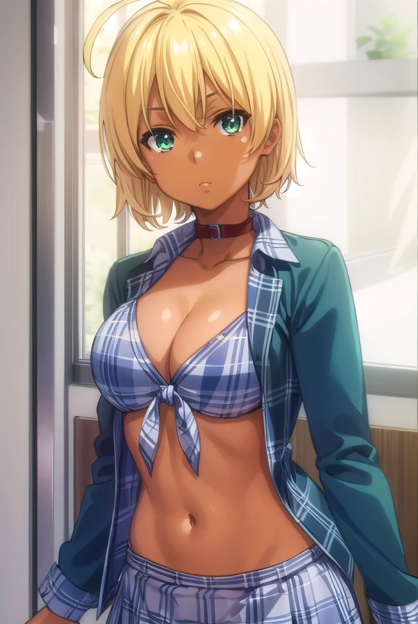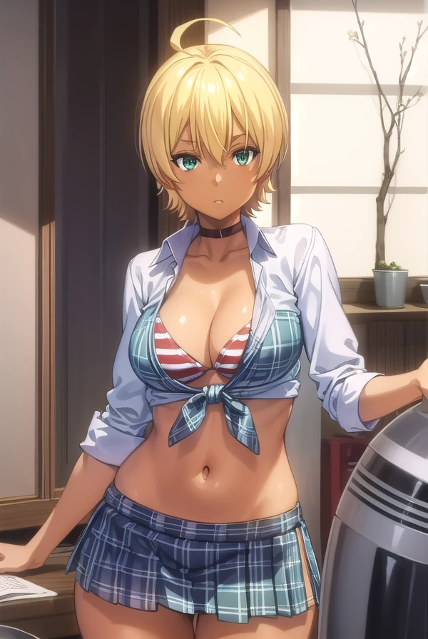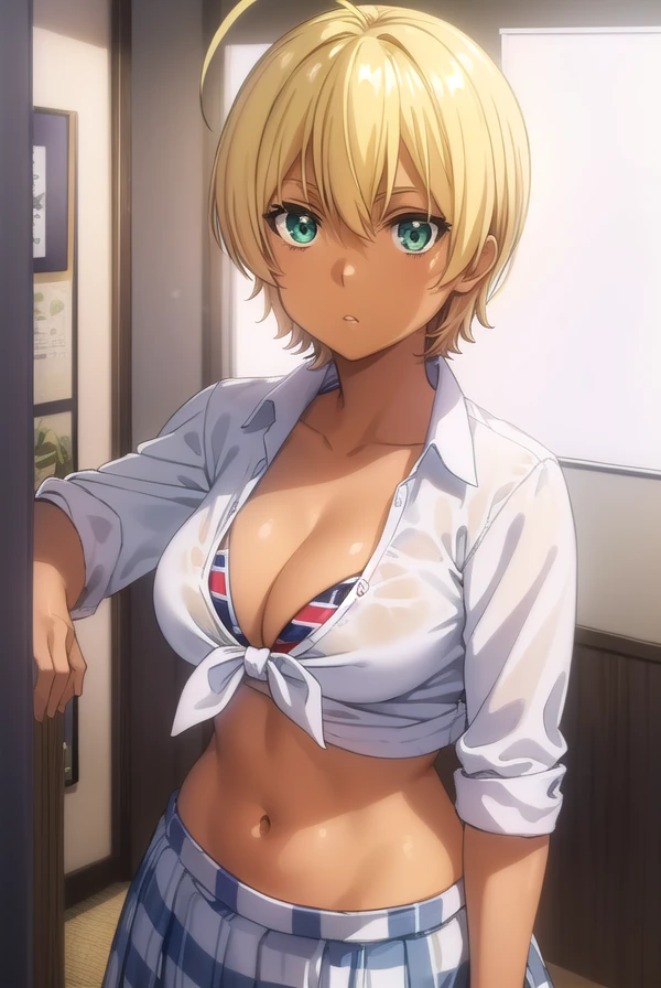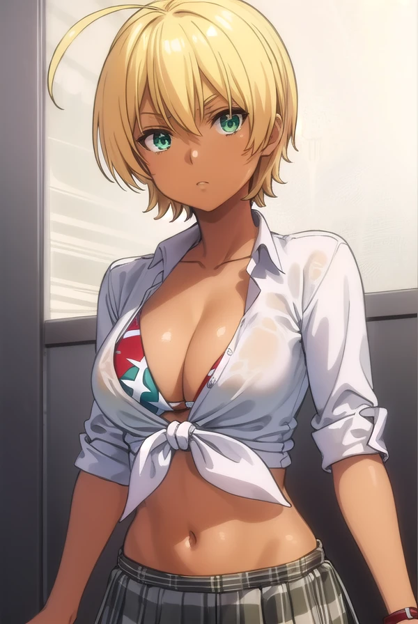 ikumi mito, short hair, blonde hair, (green eyes:1.3), ahoge, dark skin, dark-skinned female,