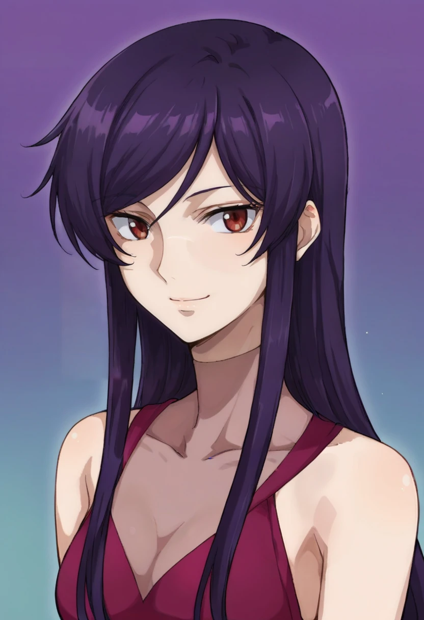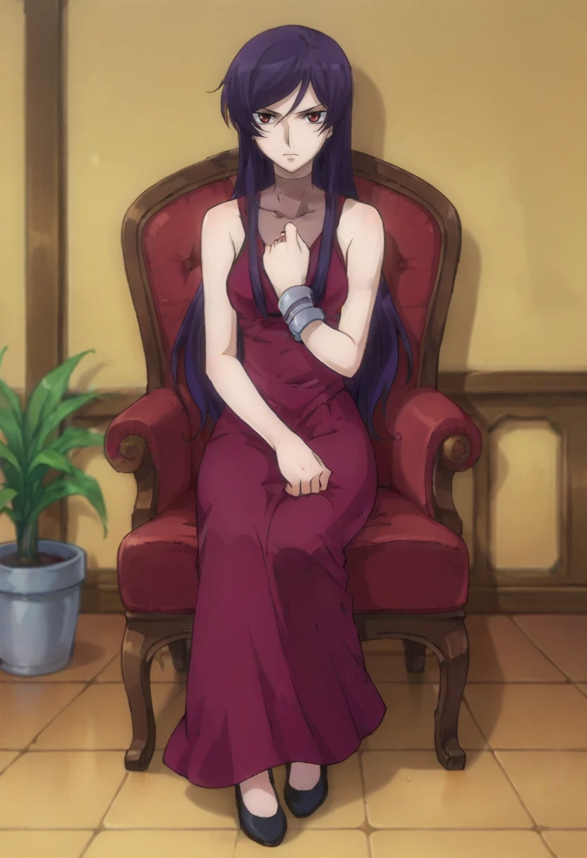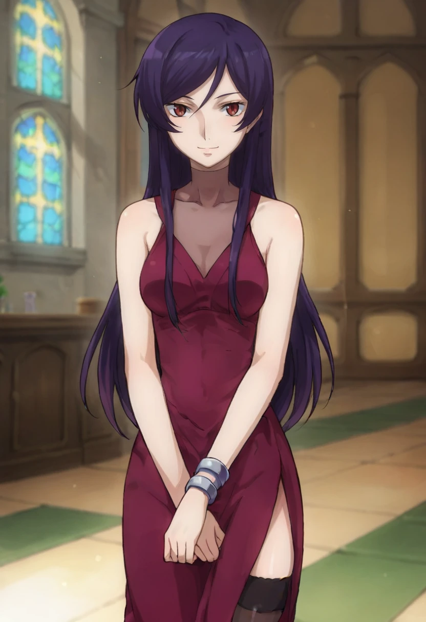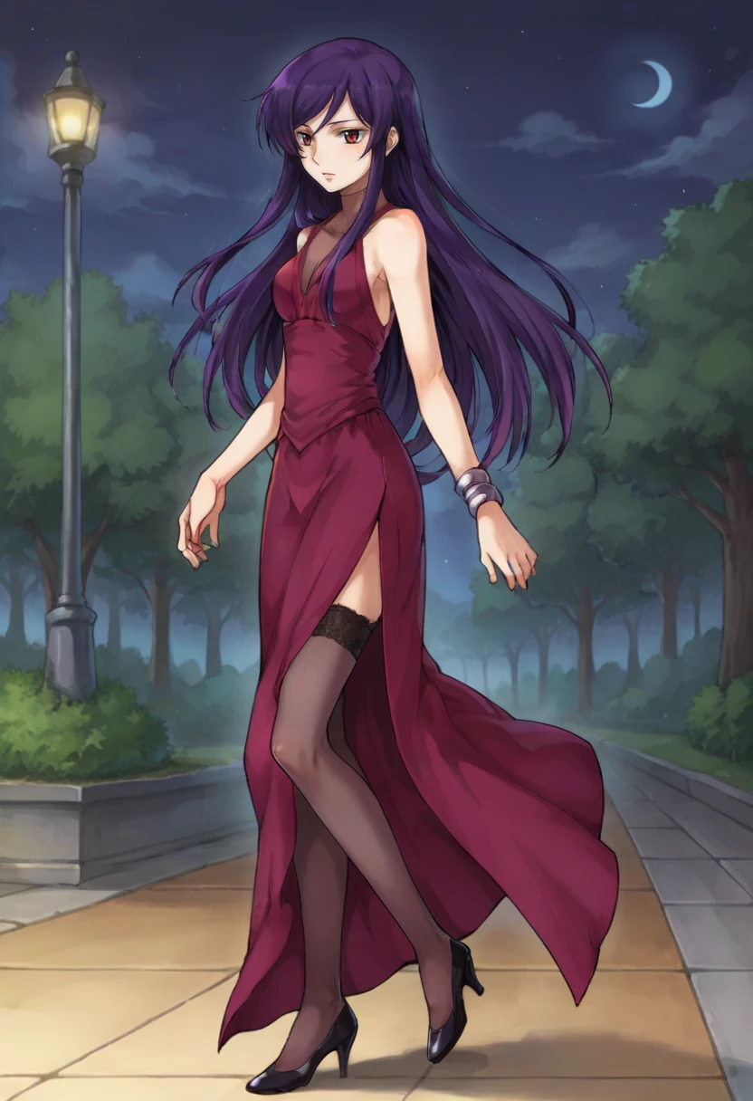 tieriacd,1other,solo,red eyes,purple hair,long hair,crossdressing,bracelet,dress,purple dress,bare shoulders,side slit,thighhighs,high heels